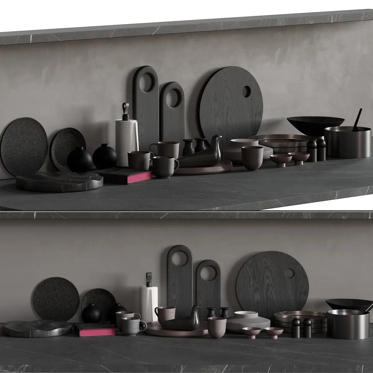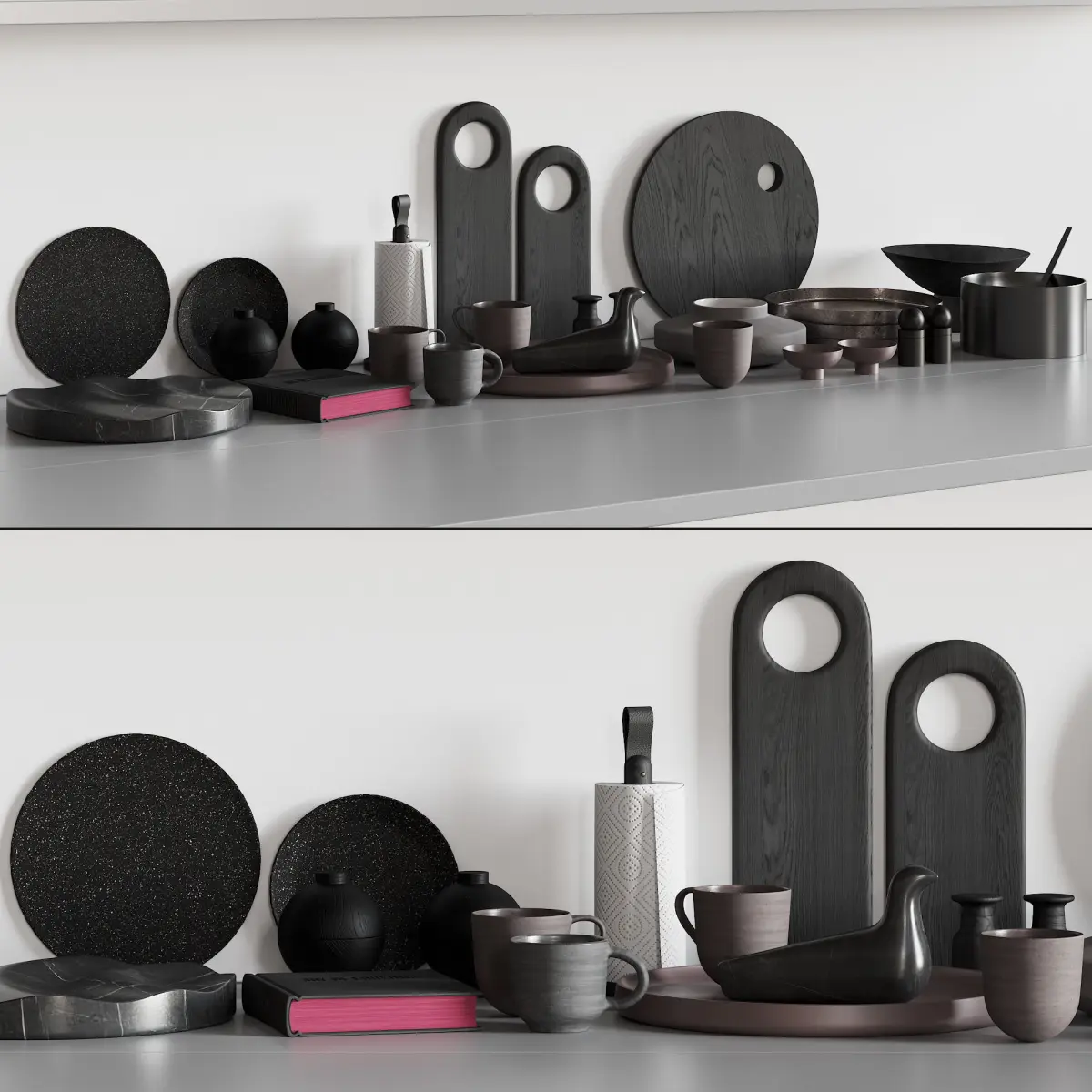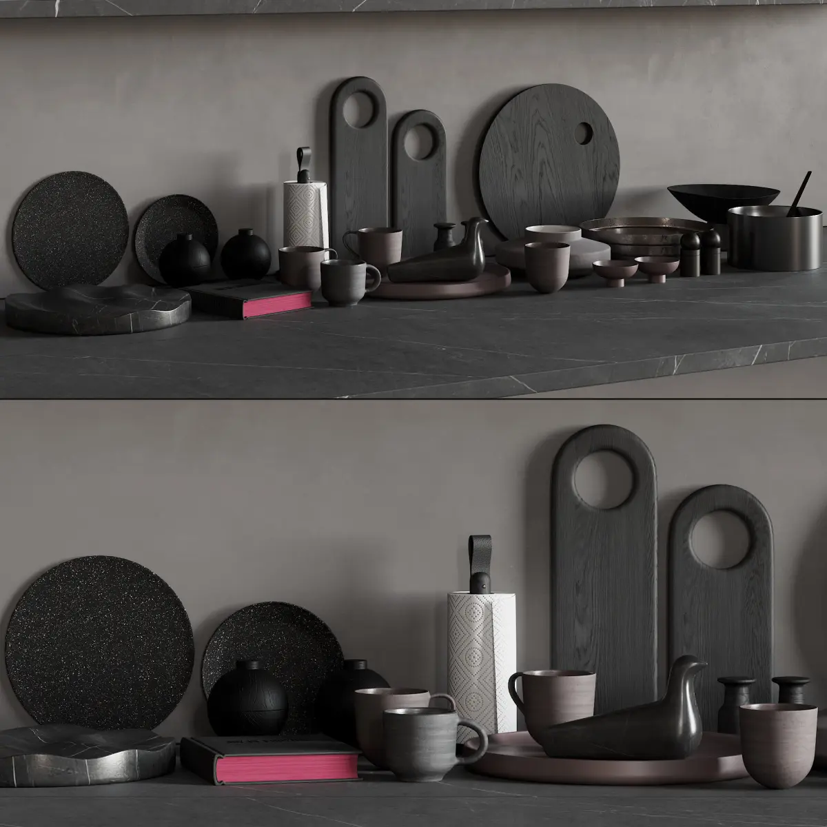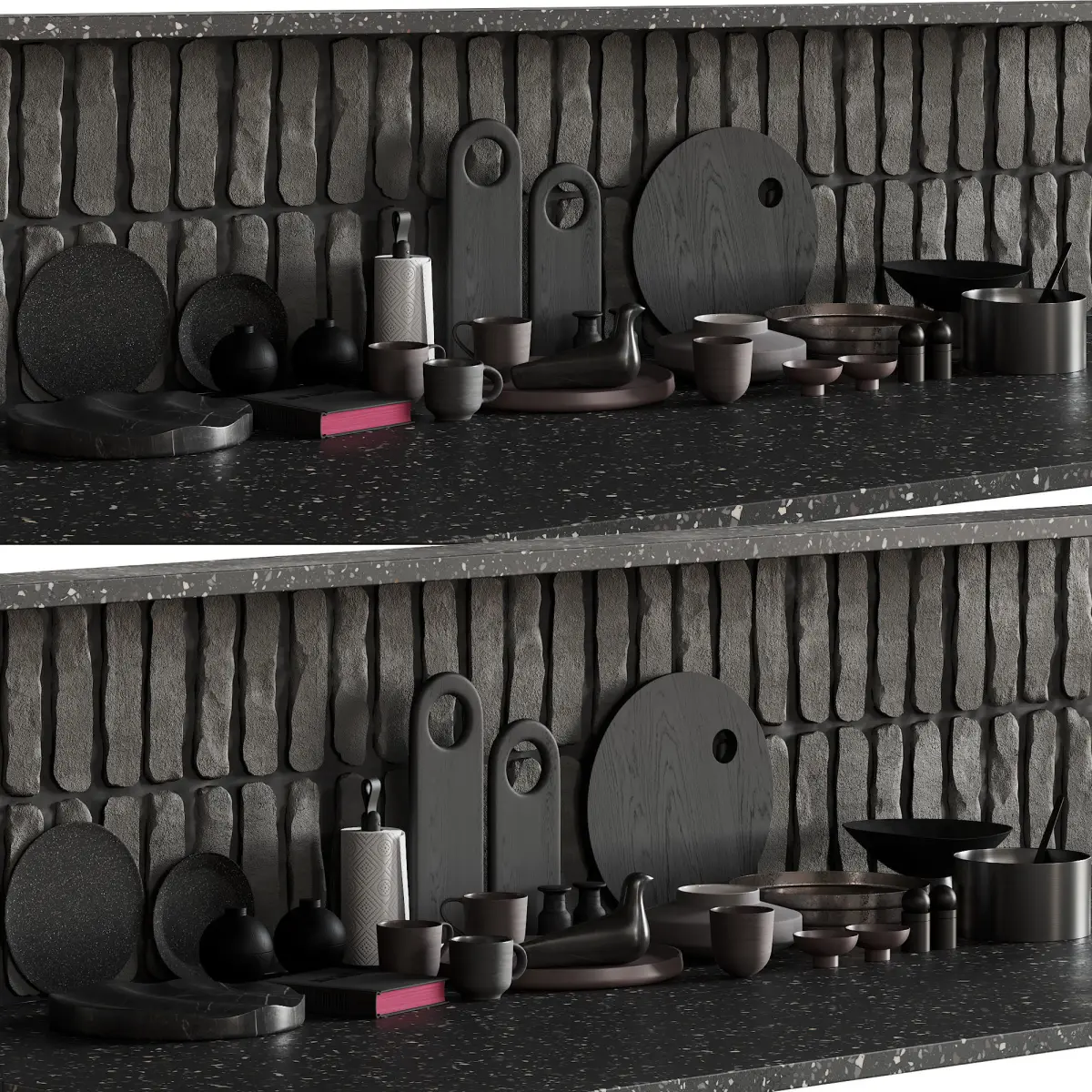 3d model of a decorative set of dishes and kitchen accessories. Suitable for placement on shelves, tables, bar counters, kitchen cabinets, etc.