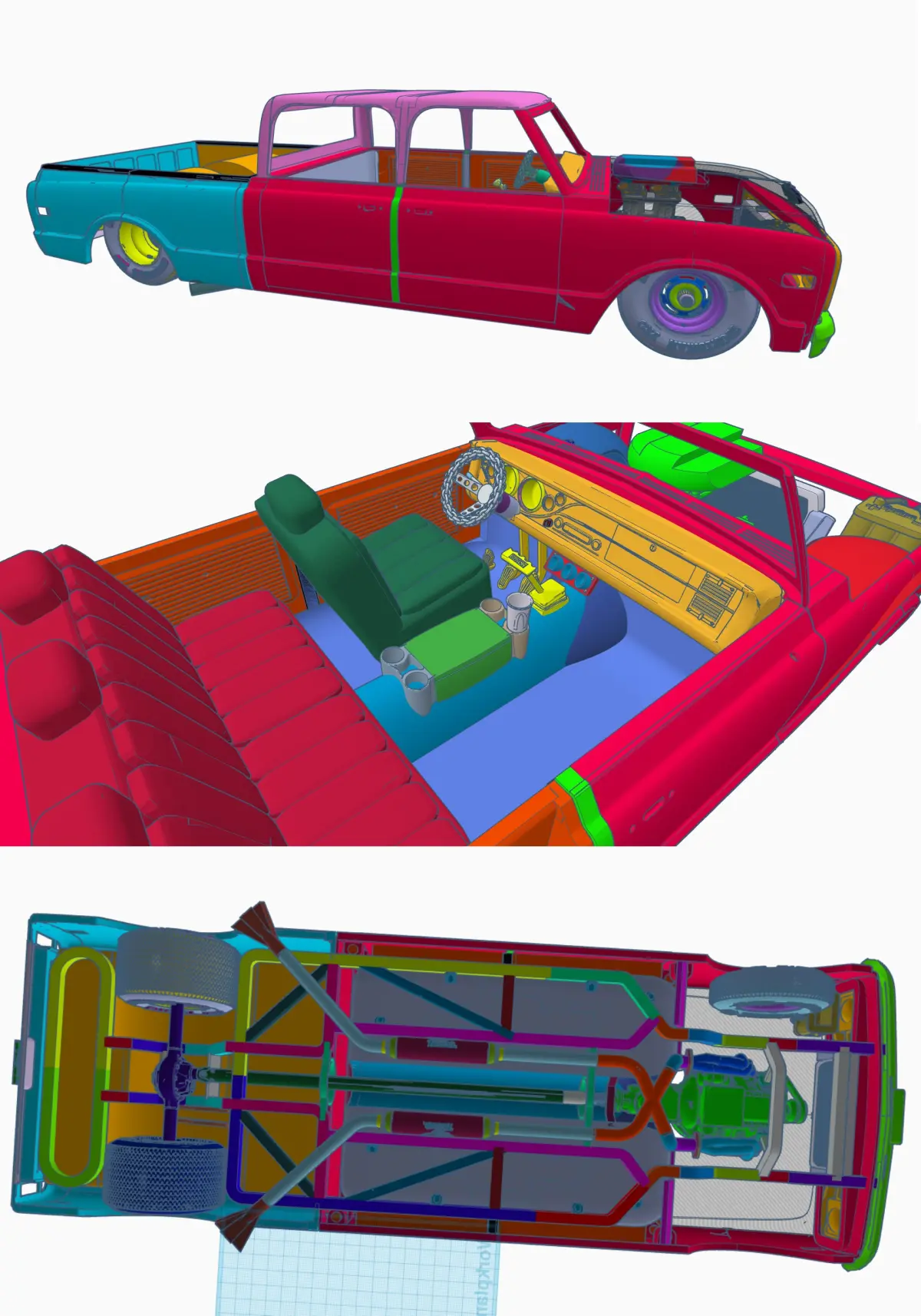 Making this printable in 1/25th scale. But as a Pro Street Truck with chassis, interior etc. This is a work in progress. I will be adding files as I go along. I will also be including a stock version down the road. Original body design was made by by Alexby in 1/10th scale and meant for Traxxis (RC car/truck chassis). AMT did produce a 69 Chevy Fleetside but that kit is super rare these days. I included a photo of that kit. You just have to provide your own wheels and motor.