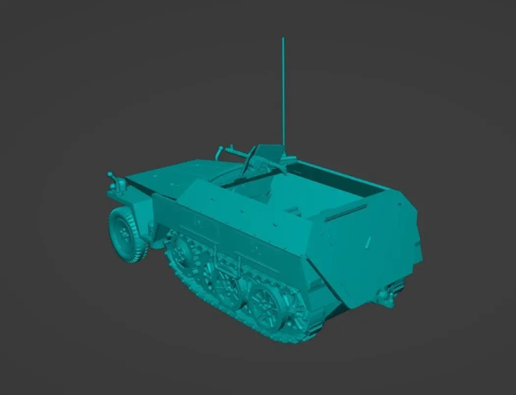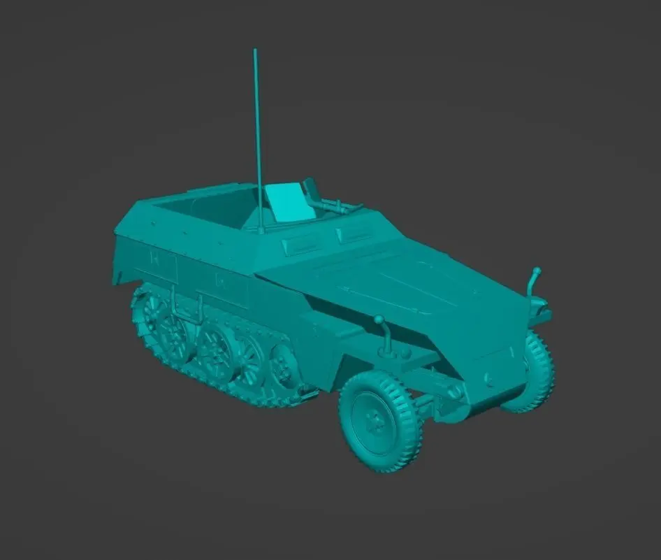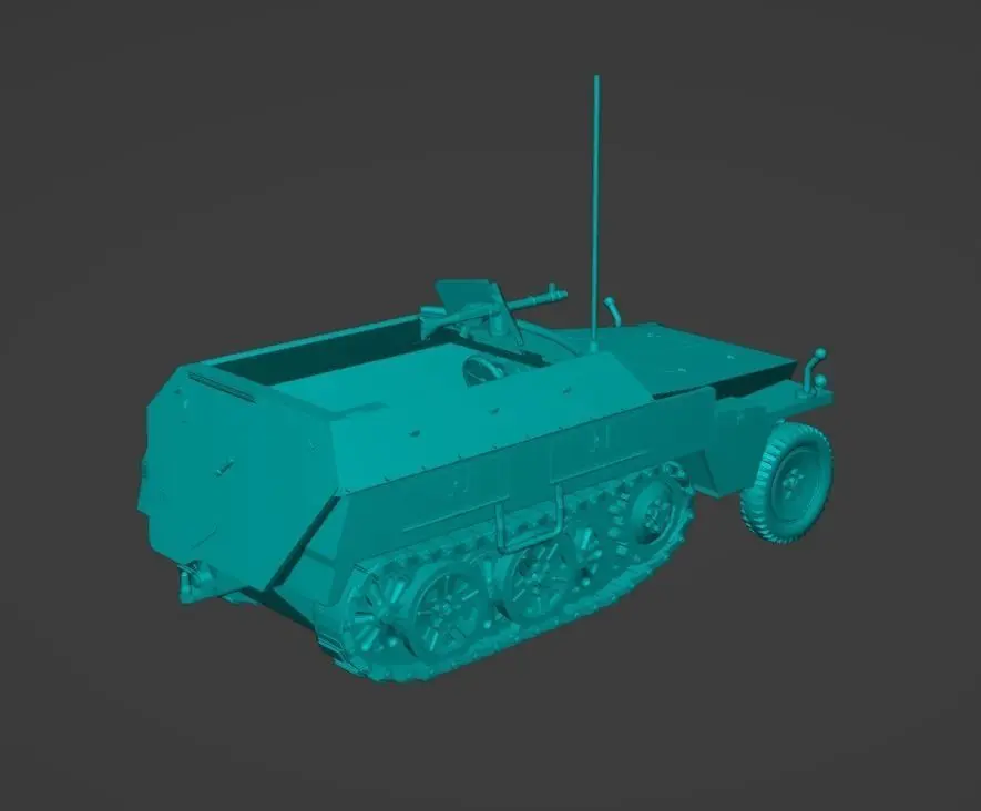 Rar file include 14 STl file. (antenna left,antenna right,foothold left,foothold right, front chassie, horn???,mg turret, radio antenna top,sdkfz250 , steering wheel, track left , track right ,wheel left and wheel right).