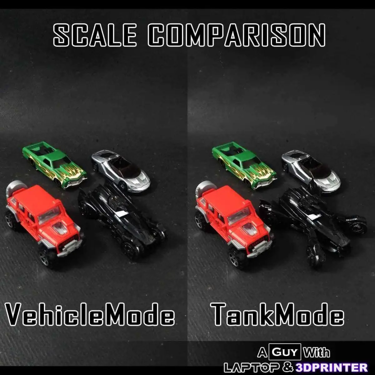This model can transform from Vehicle to Tank mode with simple mechanics. the upper part is detachable to attach the cannon for tank mode.