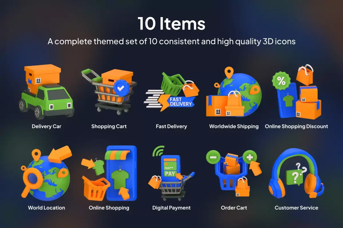 A bright and user-friendly pack of e-commerce essentials in collection of e-commerce 3D icons. Ideal for apps, websites, packaging, social media contents, or marketing visuals. Delivered in high resolution and multiple file formats for flexible use across web, app, or print.