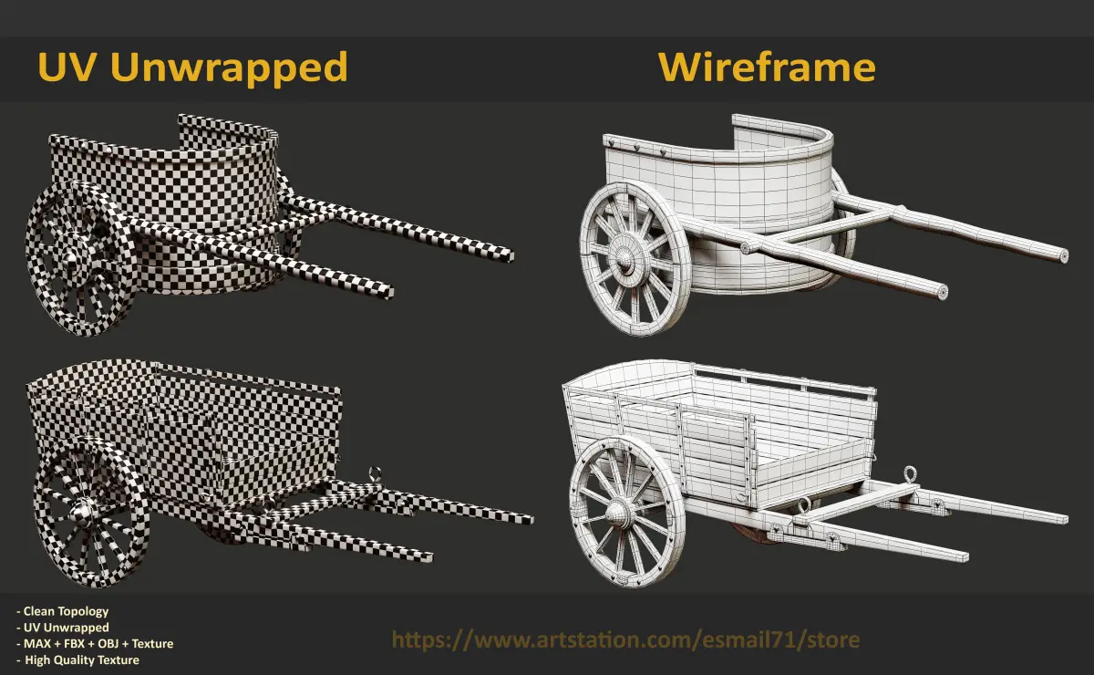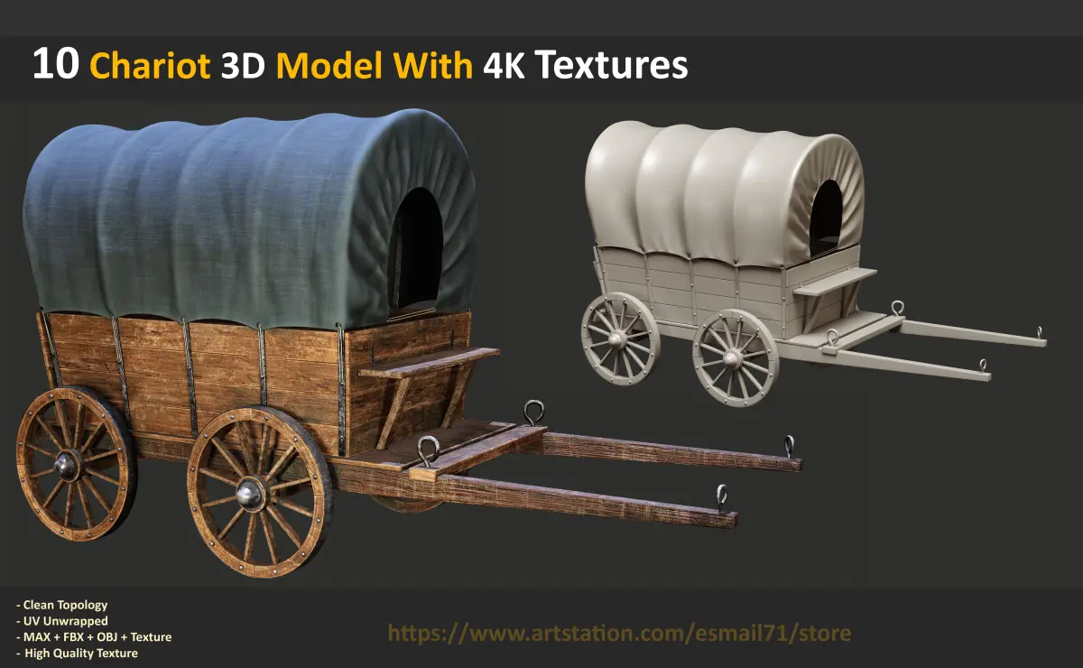 We have prepared a collection of 10 Chariot 3D Models for you, which can significantly boost your efficiency in your projects. This package comes with high-quality PBR textures, making your workflow much faster and easier. All models are highly detailed and crafted with excellent quality, while the textures are also beautifully designed and of top-notch quality.