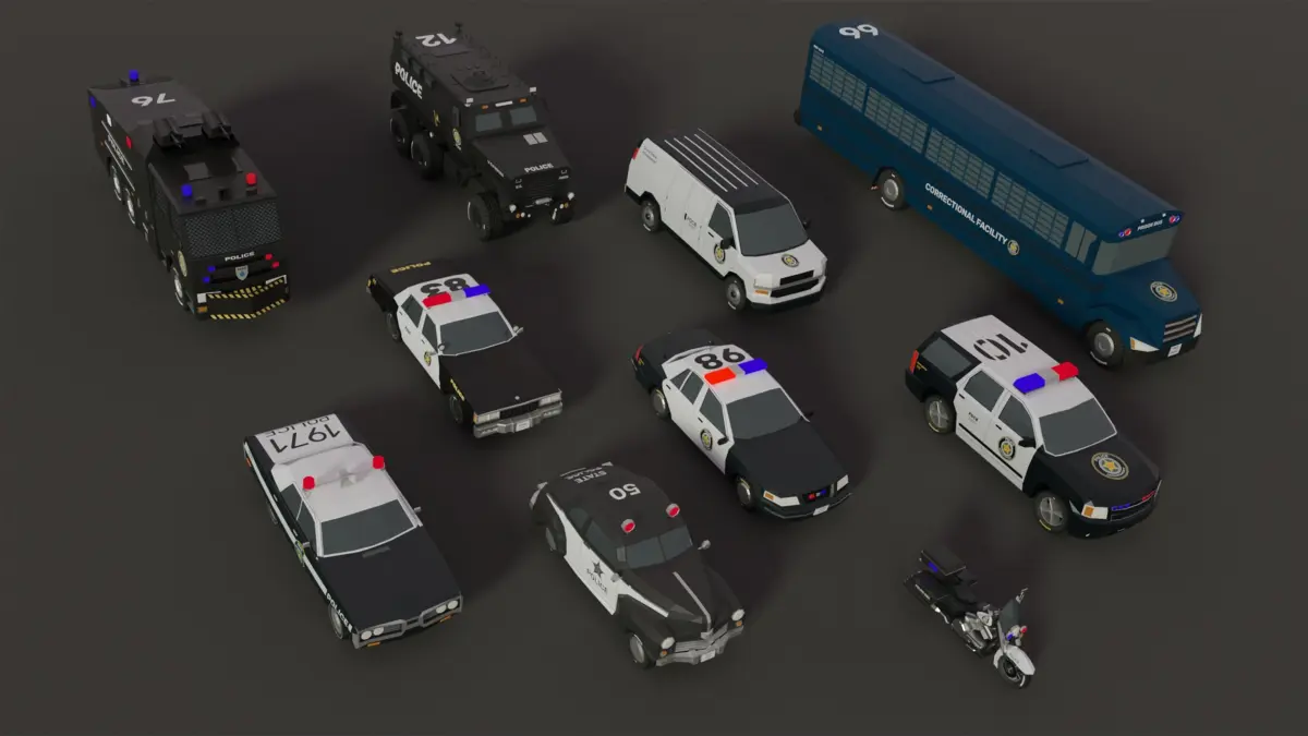 - This pack offers a diverse range of fully rigged police vehicle models, designed with a low-poly aesthetic.