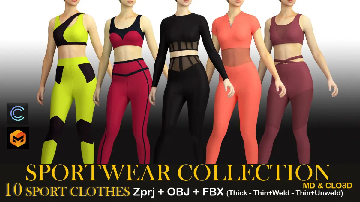 A pack of 10 different sportwear created in marvelous designer/ Clo3D.There are 10 folders in 10 zip files. each folder contains the following:_ Clo3D, Marvelous Designer project (ZPRJ) _ FBX file in A pose (Thin _ Unweld , Thin_weld , Thick) _ OBJ file in A pose (Thin _ Unweld , Thin_weld , Thick) _ All models have UV_ All models are Quad mesh_ All 10 models have totally 227429 polygons and 240789 Vertices