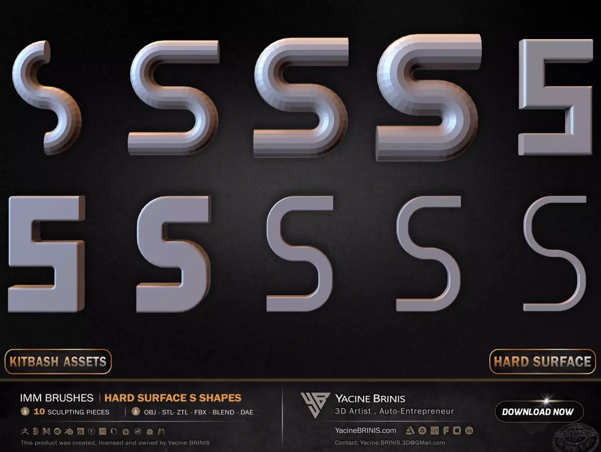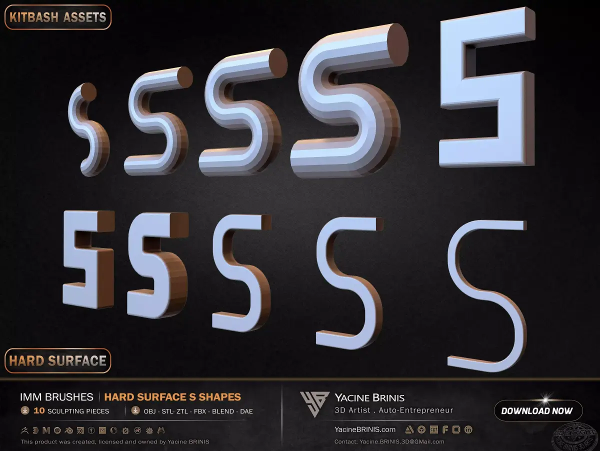 I am presenting a focused collection of 10 hard surface S-shaped elements, structured for modular construction, flow-based design, and advanced hard surface workflows.