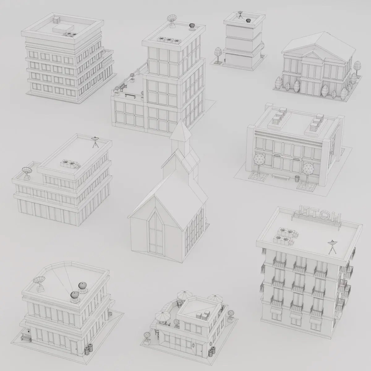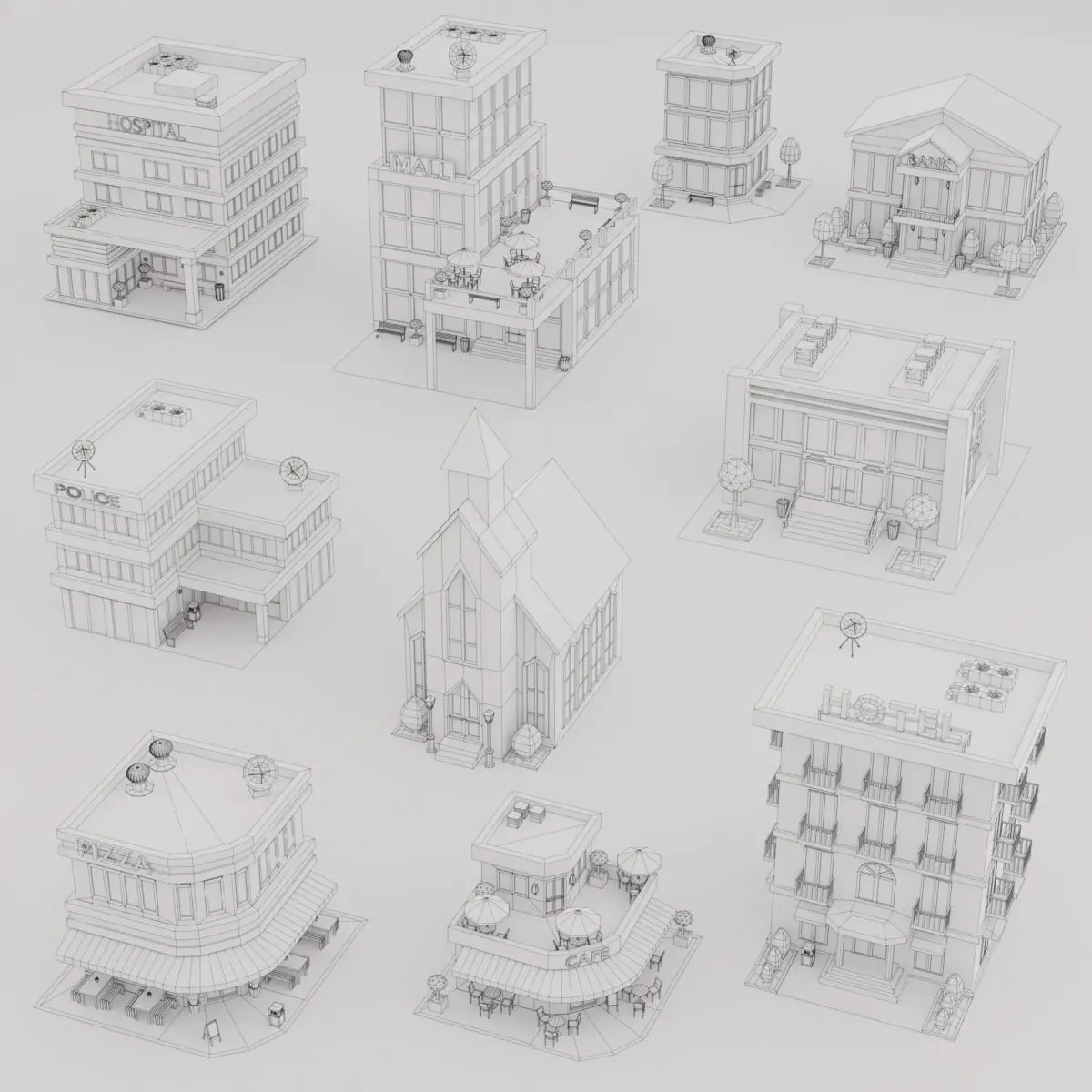 The Low Poly Buildings Set contains: 10 low poly 3D models: Bank, Cafe, Church, Corner building, Hospital, Hotel, Mall, Pizza, Police, School.