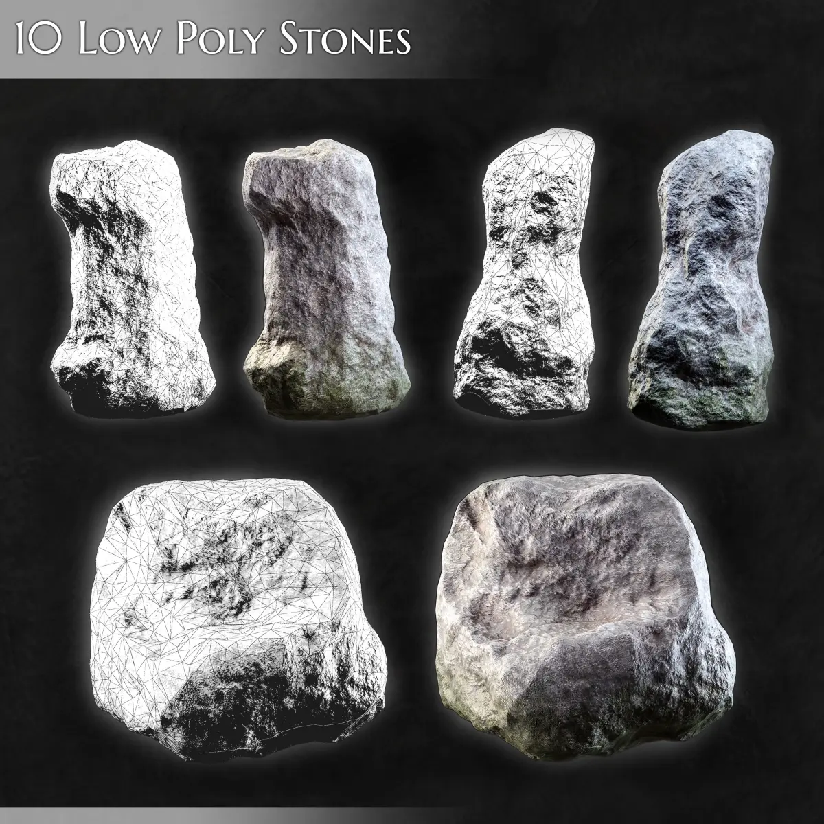 2048 x 2048 px. PNG (16bit)Maps: BaseColor, Roughness, Height, NormalLow Poly3ds Max + Obj + FbxStone 1: Tris: 920 Verts: 462Stone 2: Tris: 1156 Verts: 580Stone 3: Tris: 1222 Verts: 613Stone 4: Tris: 2176 Verts: 1090Stone 5: Tris: 1732 Verts: 868Stone 6: Tris: 1026 Verts: 515Stone 7: Tris: 1510 Verts: 757Stone 8: Tris: 1374 Verts: 689Stone 9: Tris: 2088 Verts: 1046Stone 10: Tris: 2254 Verts: 1129