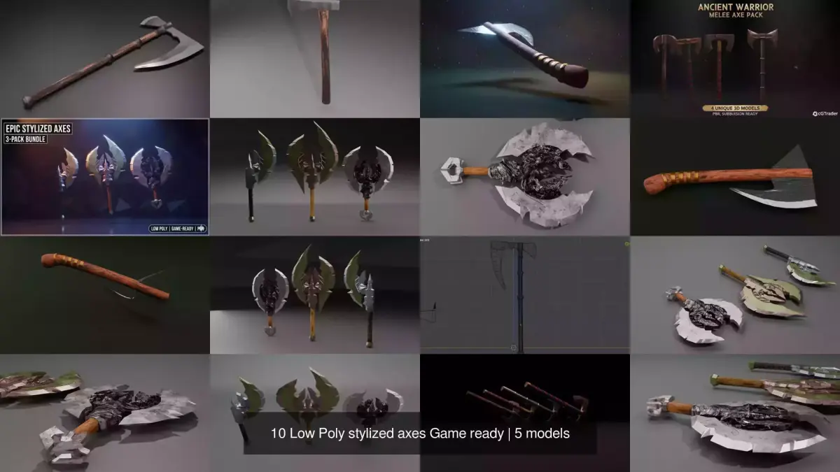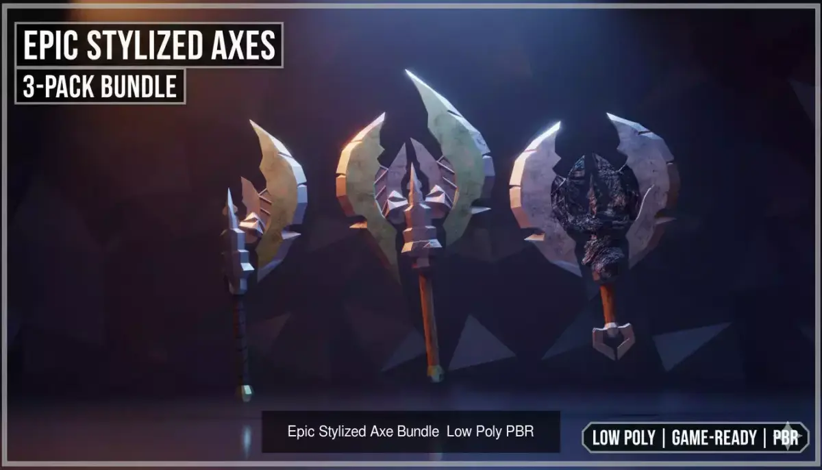 The Arsenal BreakdownCategory,DescriptionElder/Mythic Axes,Three oversized, ornate axes with green-patina blades and intricate centerpiece detailing. Perfect forLegendaryloot drops.Standard Battle Axes,Classic double-headed designs with varying handle wraps and blade shapes, ranging from clean iron to wood-grain textures.Tactical Hand Axes,Smaller, utilitarian designs including a classic hatchet and a curved bearded axe for quick-striking characters.Heavy Pole-Axes,Long-handled variants designed for two-handed reach, featuring heavy crescent and wedge-shaped blades.Technical SpecificationsGeometry: Low-poly (Tri-dominant/Quads).