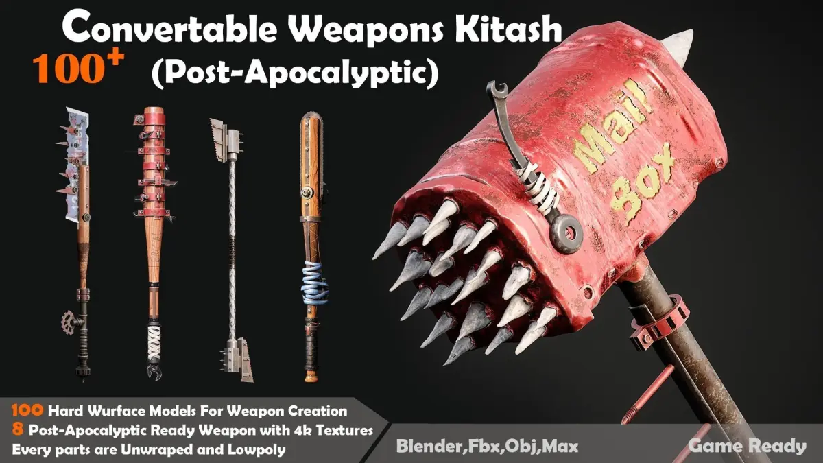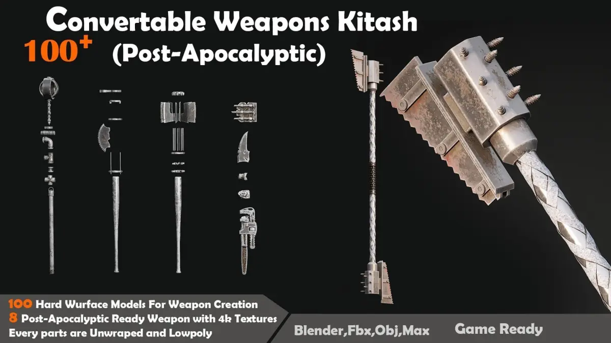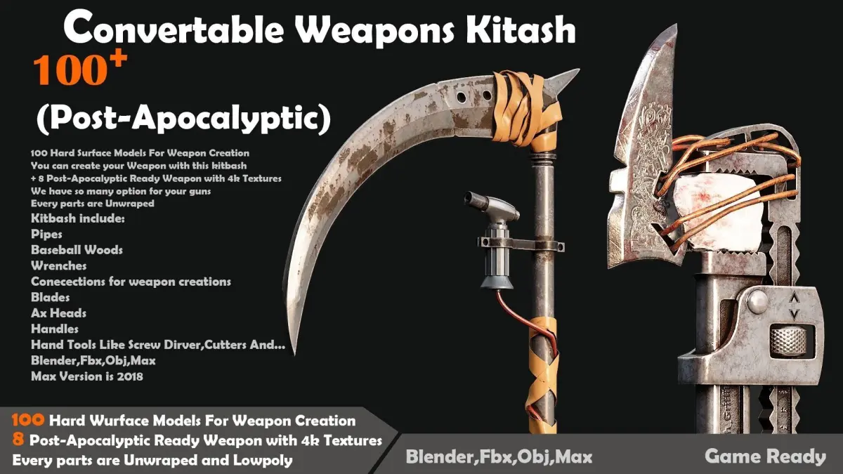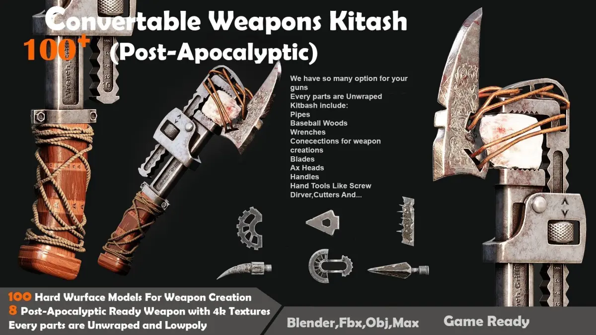 - 8 Post-Apocalyptic Ready Weapon with 4k TexturesWe have so many option for your gunsEvery parts are UnwrapedKitbash include:PipesBaseball Woods WrenchesConecections for weapon creationsBladesAx HeadsHandlesHand Tools Like Screw Dirver,Cutters And...We Put help video for You in ArchiveBlender,Fbx,Obj,MaxMax Version is 2018