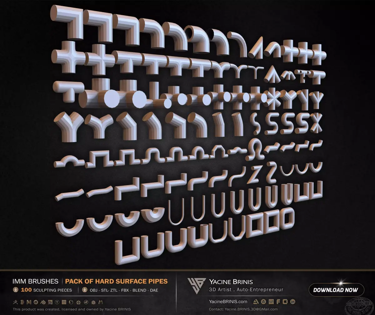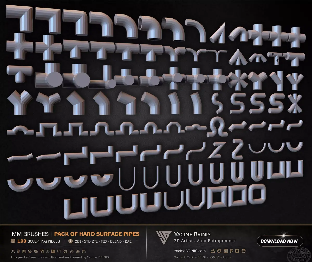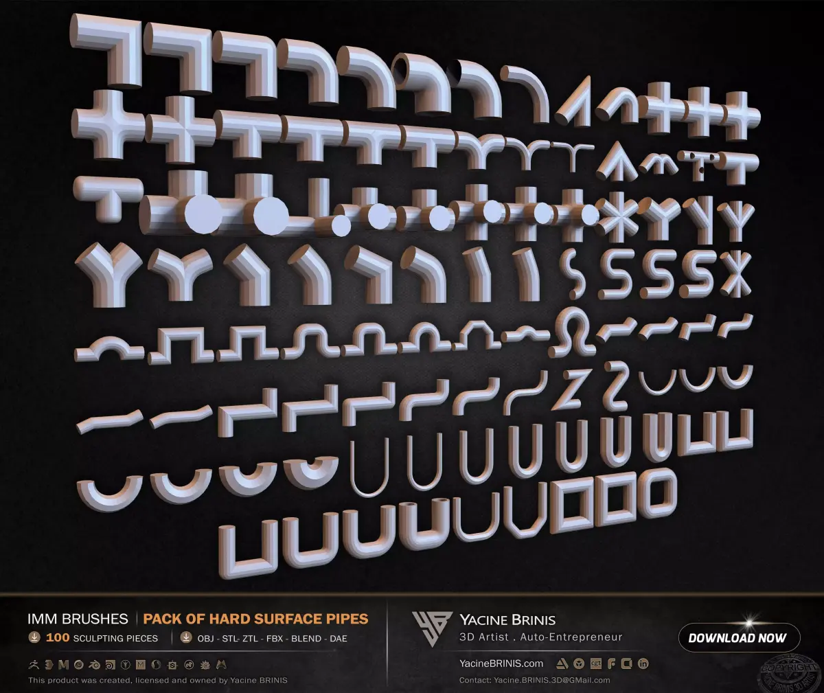 I am presenting a detailed collection of 100 hard surface IMM pipe elements, structured for modular construction, mechanical assemblies, and complex hard surface workflows.