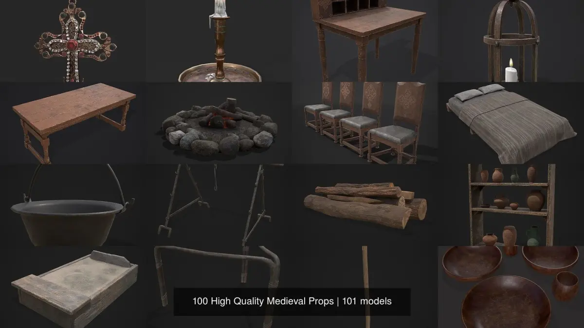 100 High Quality Medieval Props - 100 3D Models- Files Include FBX and OBJ. Includes PBR Texture in 4096 x 4096. - Maps include : Basecolor, Normal, Roughness, Height and Metallic. Some models include AO, SSS, Opacity and Emmisive maps. All Preview renders were done Marmoset Toolbag 4 Scaled to real world scale.