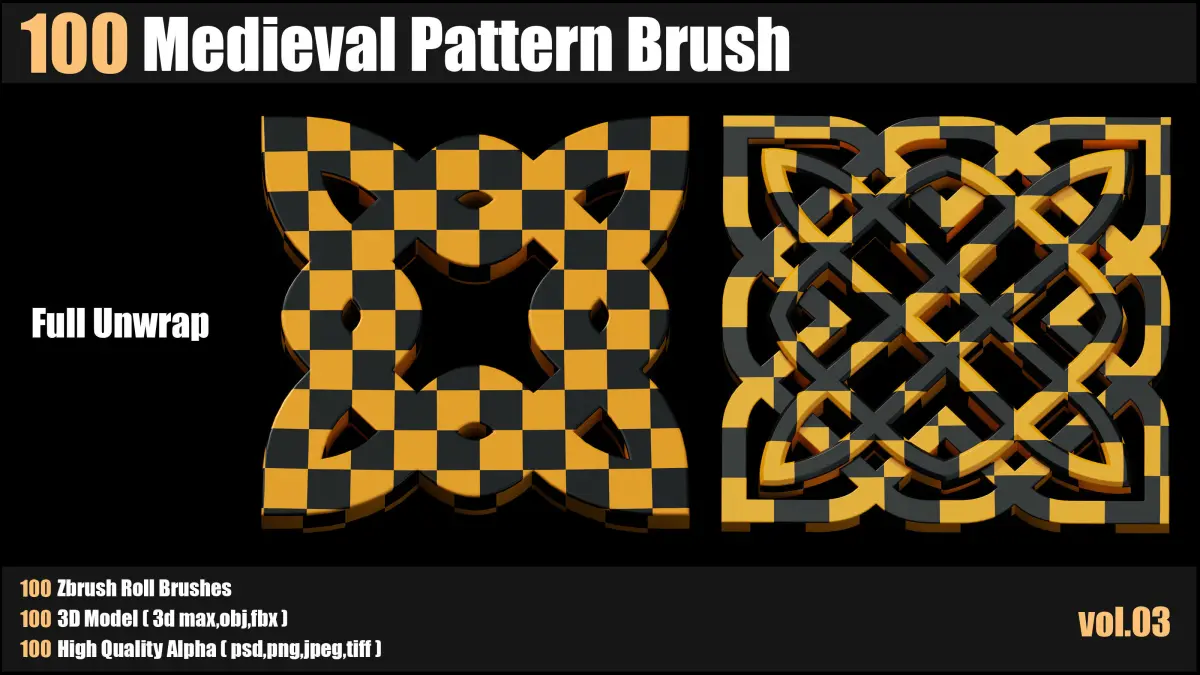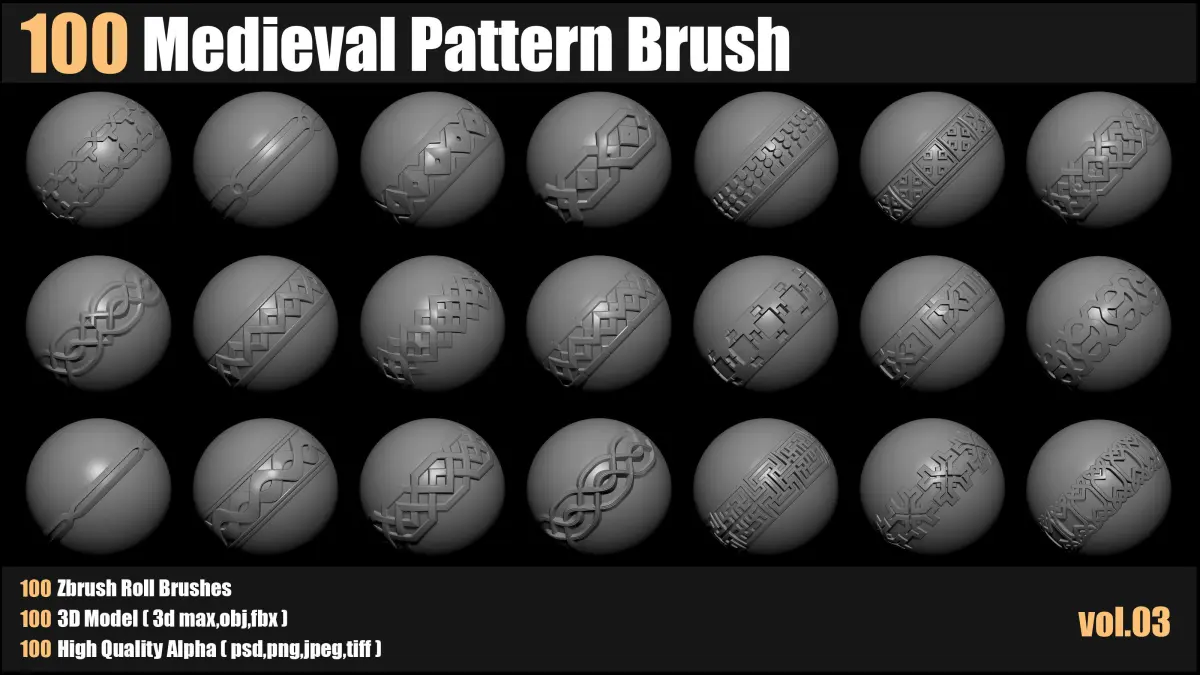 This Product includes 100 medieval Ornament patterns Brushes for Zbrush and 100 3d models for use any 3d software 3dmax,maya,blender,C4D,..