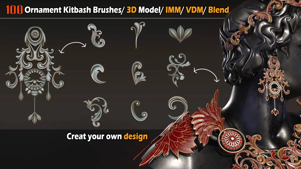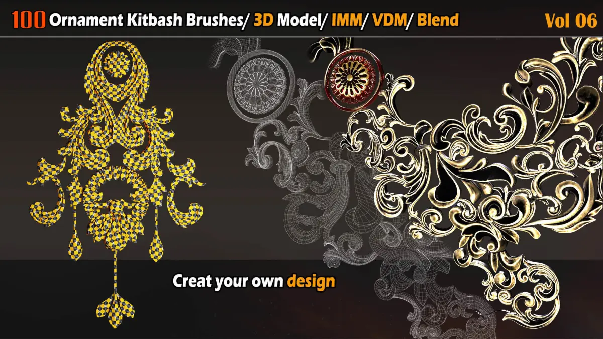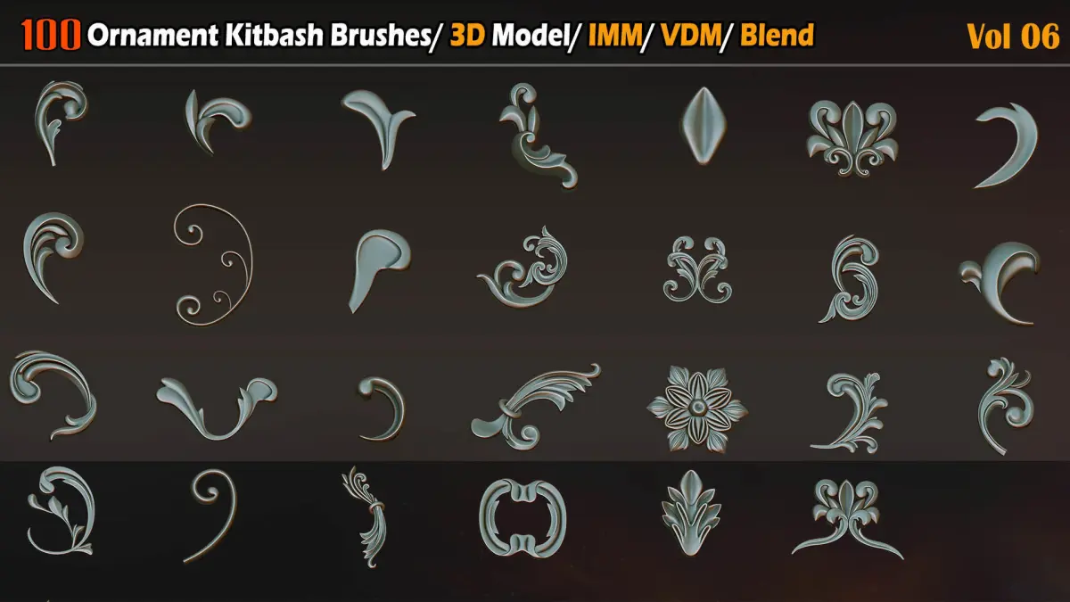 -This product contains 100 Ornament Kitbash Brushes/ 3D Models/ IMM/ VDM Vol 06.-used for any program that works with alphas and height maps.-The turbosmooth on the Max is off