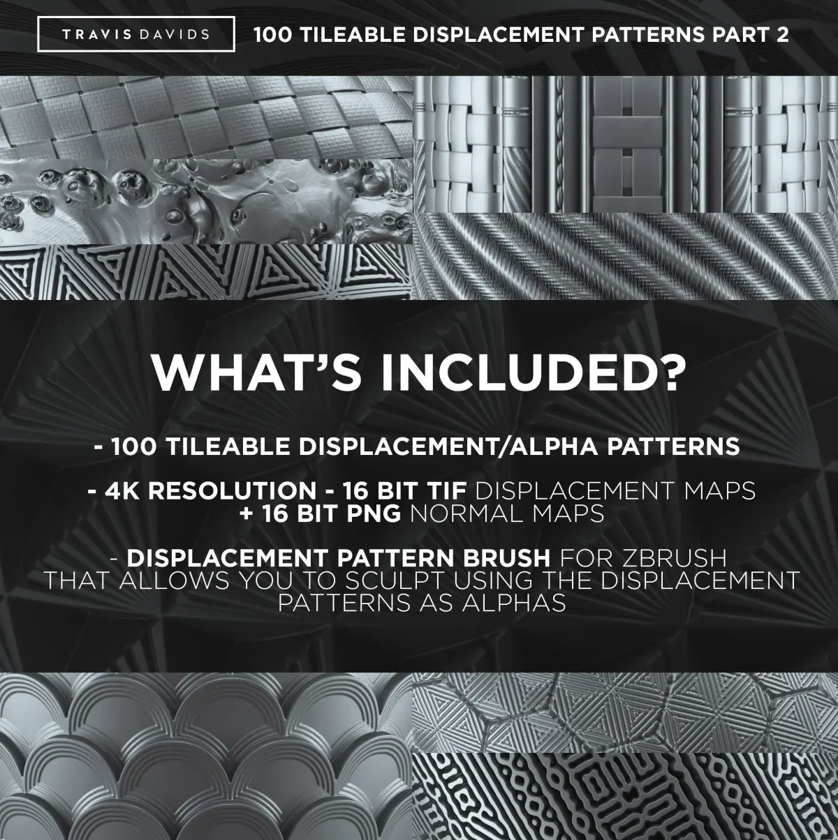 These displacement patterns are useful for quickly detailing simple geometry or adding more complex surface detail to your 3D models.