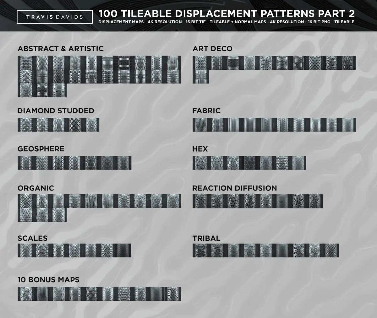 Every displacement map has been created as a 16-bit tif to ensure high quality displacement results. All Normal Maps were saved at 16-bit depth to preserve the high quality. This means there will be no artifacts visible when using normal maps.