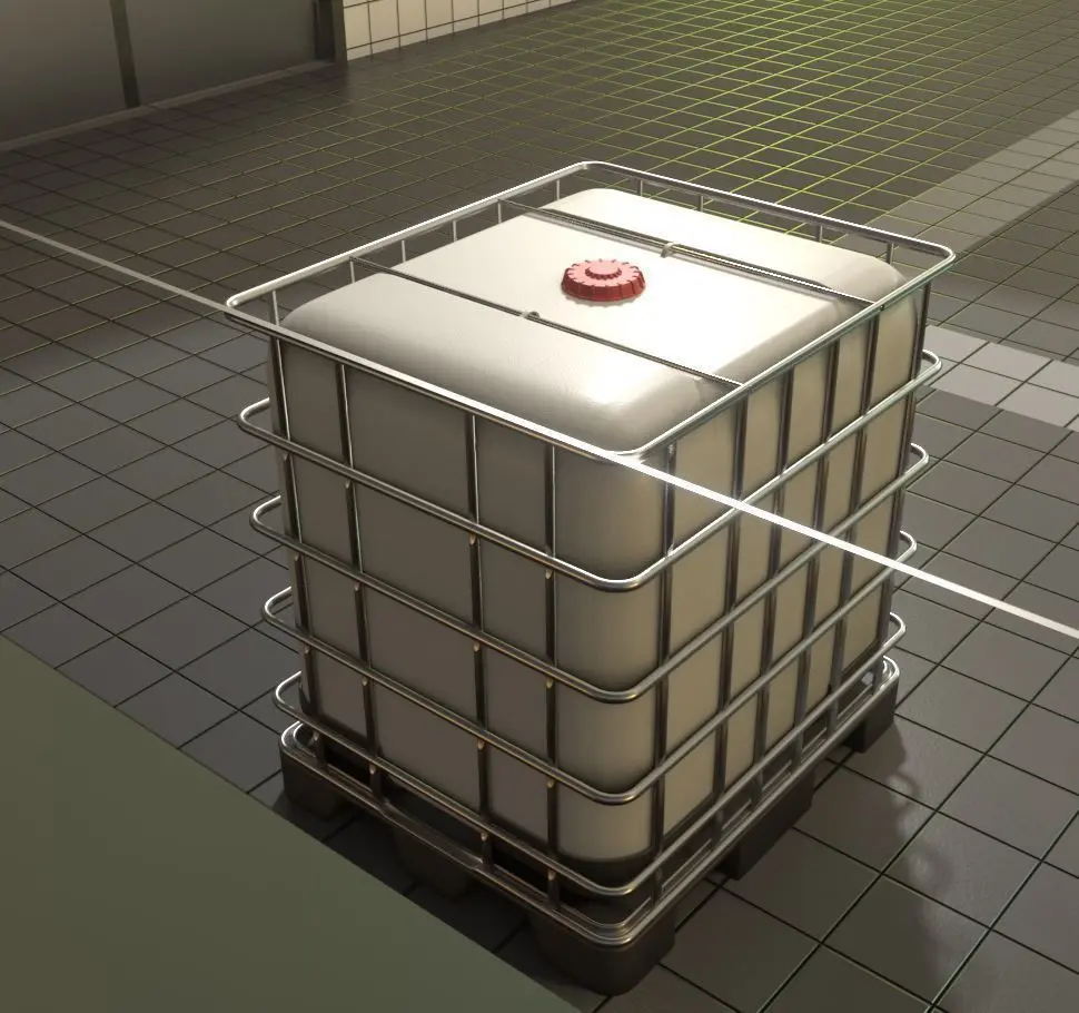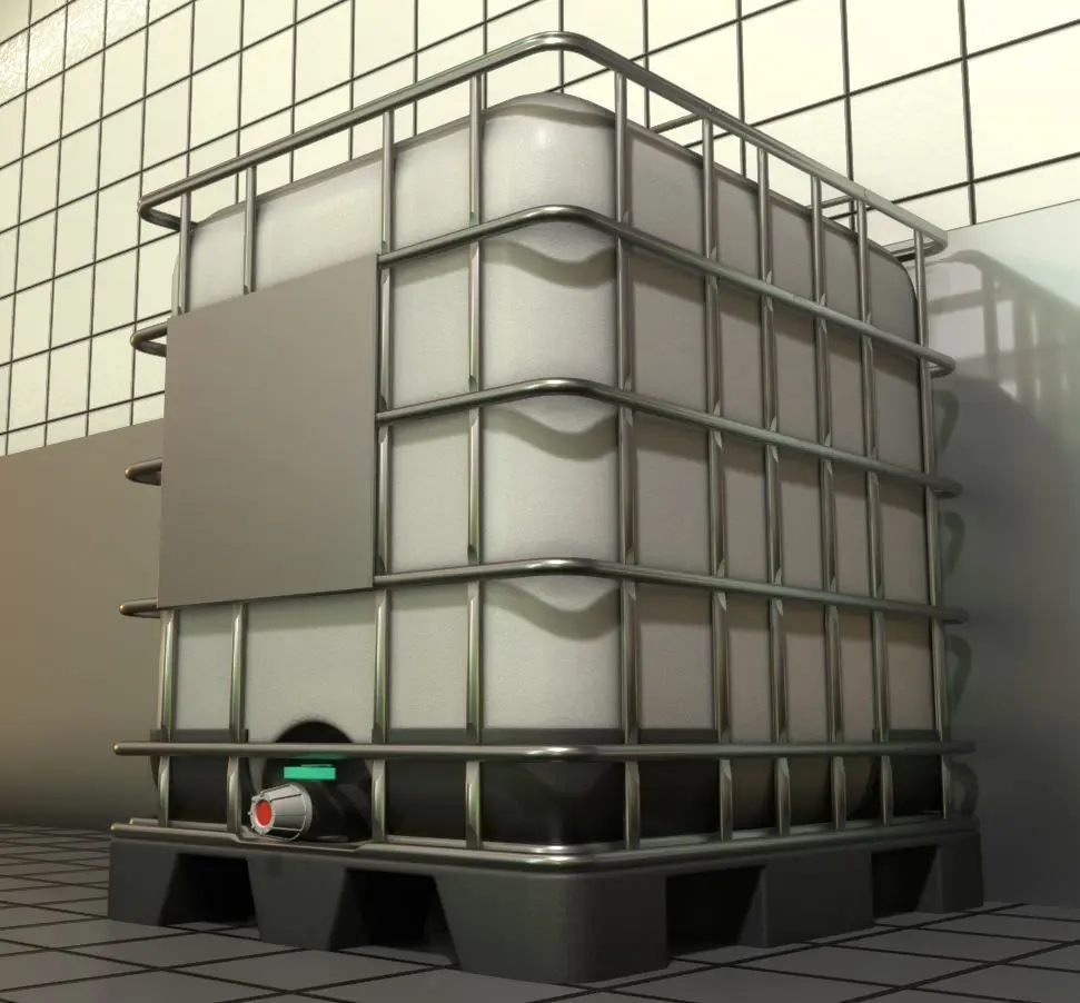 A 1000-liter IBC container (high-poly model). It is part of a redox battery. The container is subdiv-ready and the modifiers are not applied.
