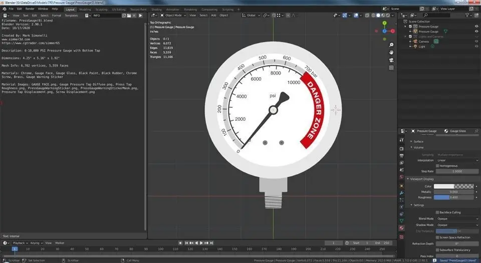 Mesh Info: 6,702 vertices, 5,559 facesMaterials: Chrome, Gauge Face, Gauge Glass, Black Paint, Black Rubber, Chrome Screw, Brass, Gauge Warning Sticker