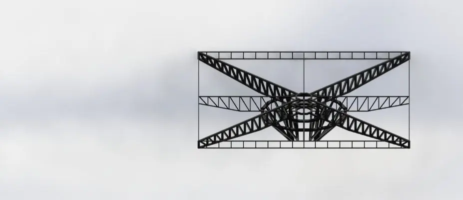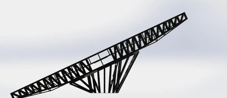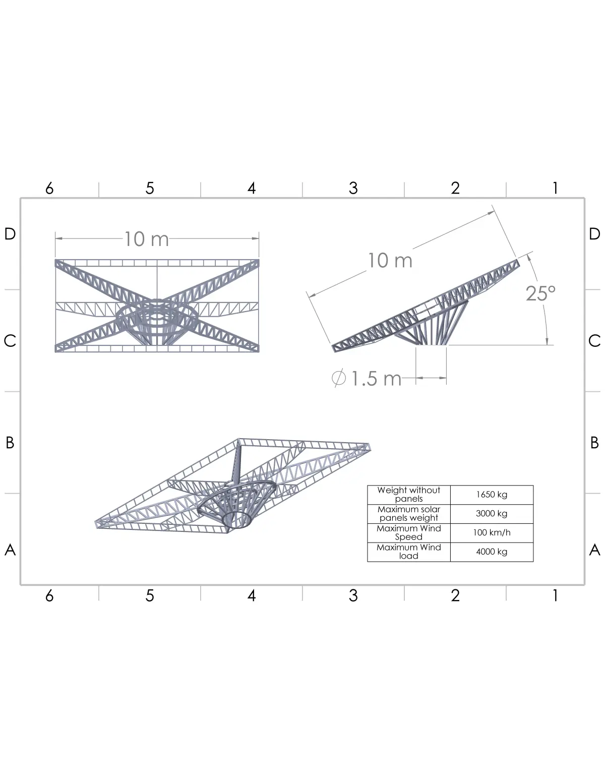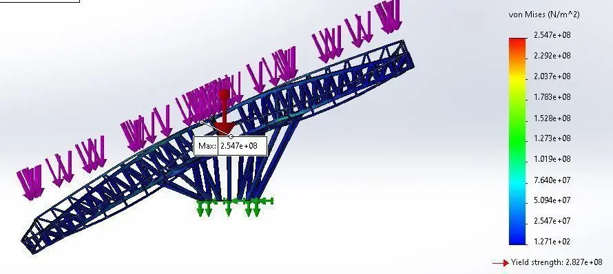 This base can hold 100 m2 of solar panels, we set the pitch angle about 25 degree, this base can turn around vertical axis.Solar panels area: 100 m2Solar panels max weight: 3000 kgMax wind speed: 100 km/sPitch angle: 25 degreeBase weight: 1650kgit is assembled using 8cmx8cm square tube (St 37)The design loads are simulated using Solidwork Simulation