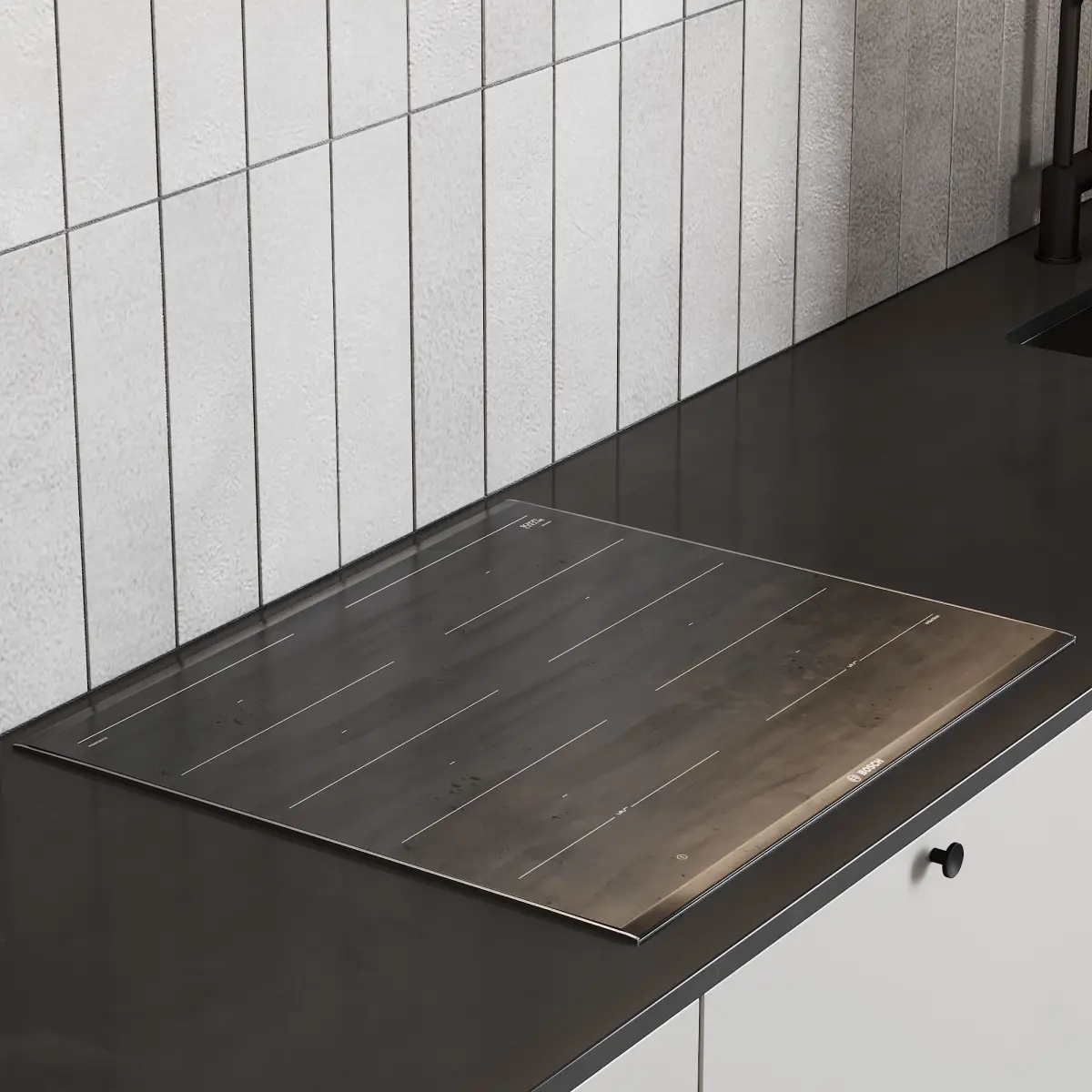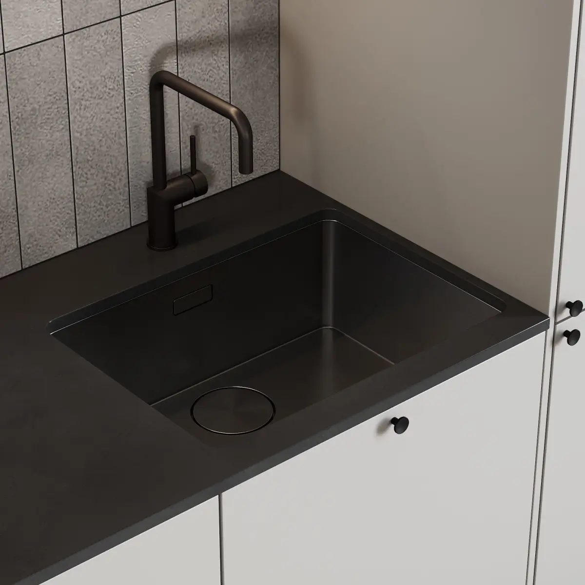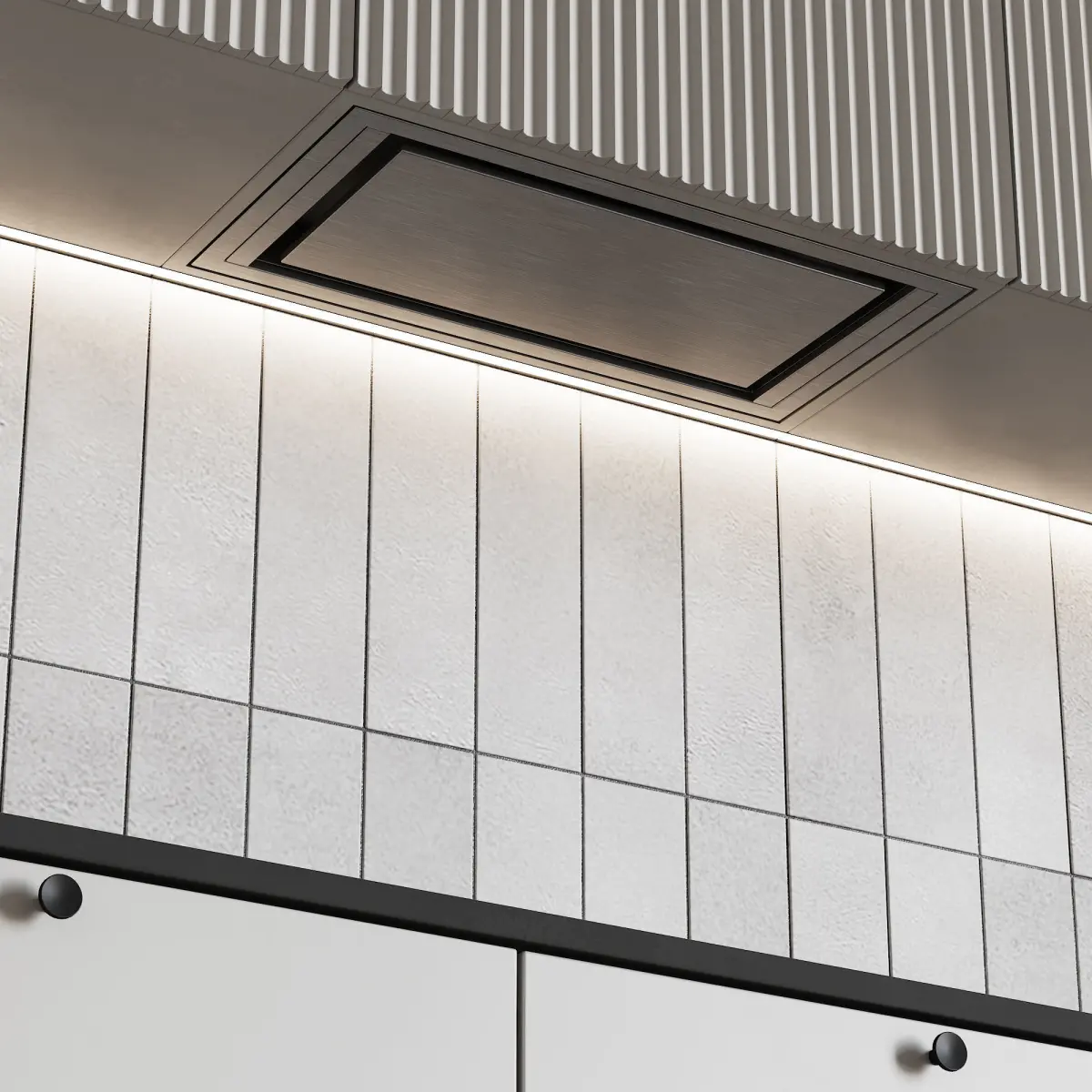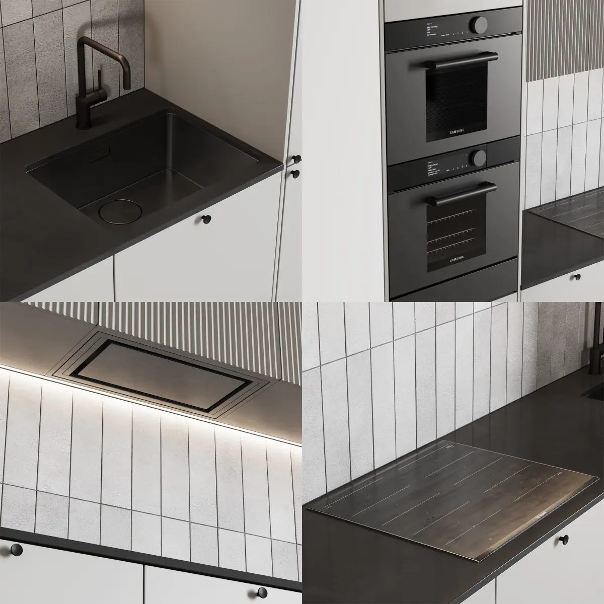3d model of a kitchen in a modern style. The kitchen has an oven and microwave, mixer, sink, built-in extractor fan and induction hob.All cabinets are made as separate objects, and the kitchen is assembled into a group. The whole kitchen is very easy to edit in size.