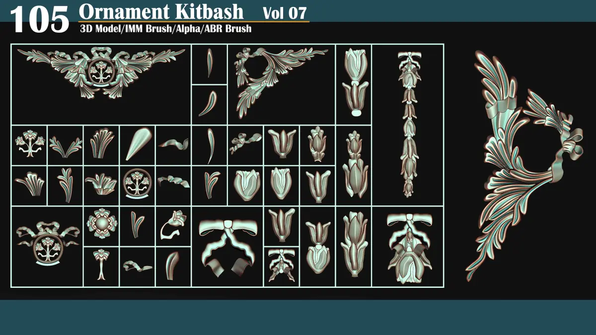 -This product contains 105 Ornament Kitbash Brushes/ IMM/ ABER/ Alpha / Blend/ 3D Models Vol 07.