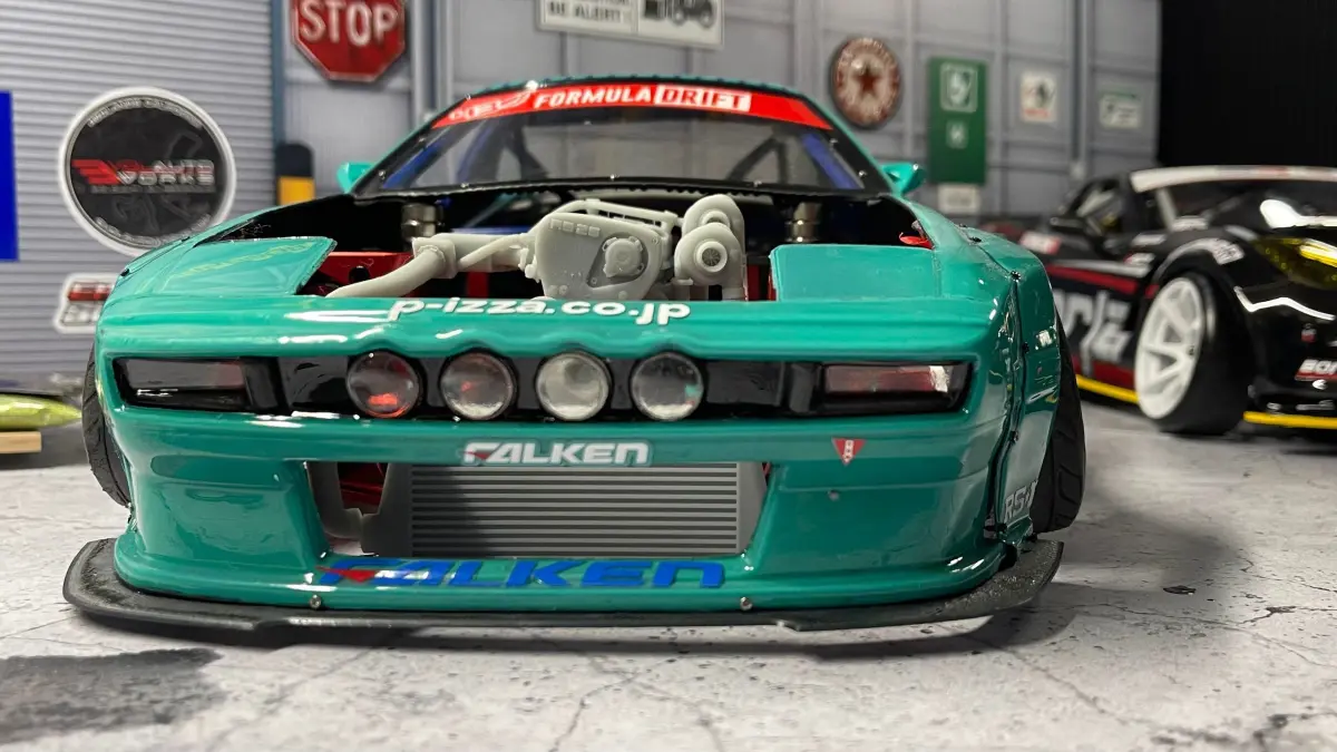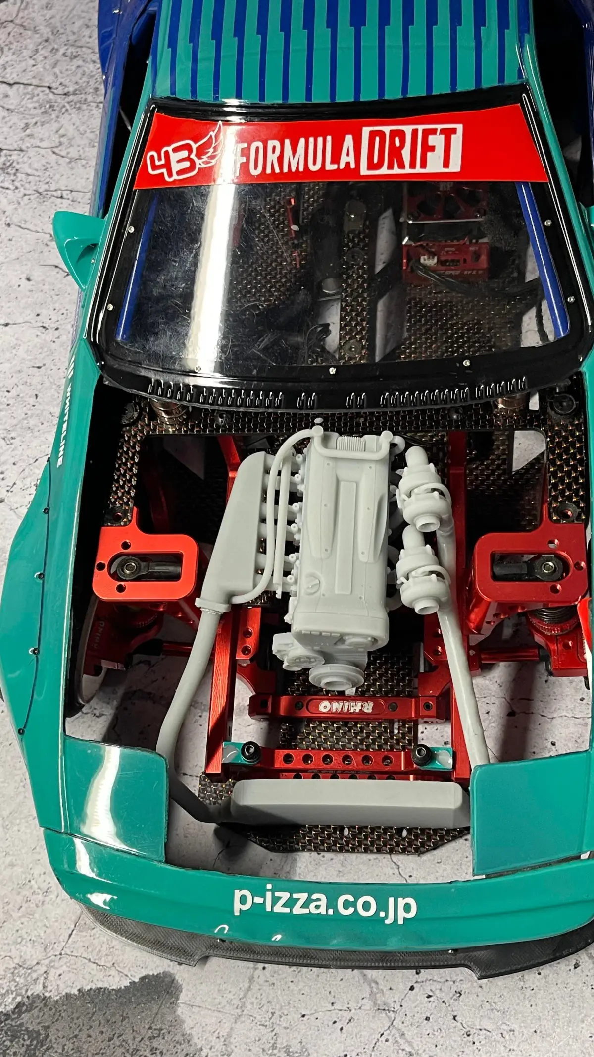 This is a Nissan RB26 (RB26DETT) engine model for Rhinomax II chassis. It consists of multiple parts, which need to be glued together after painting. Whole assebly can be detached any time by just undoing 2 bolts holding the intercooler brace to the chassis.
