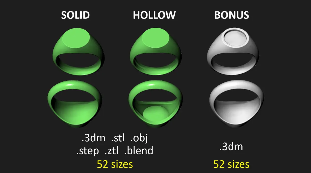 Also, the package contains .ZTL (ZBrush 2021.1) and .BLEND (Blender 3.2) files, in which all ring sizes are centered and collected in one file.