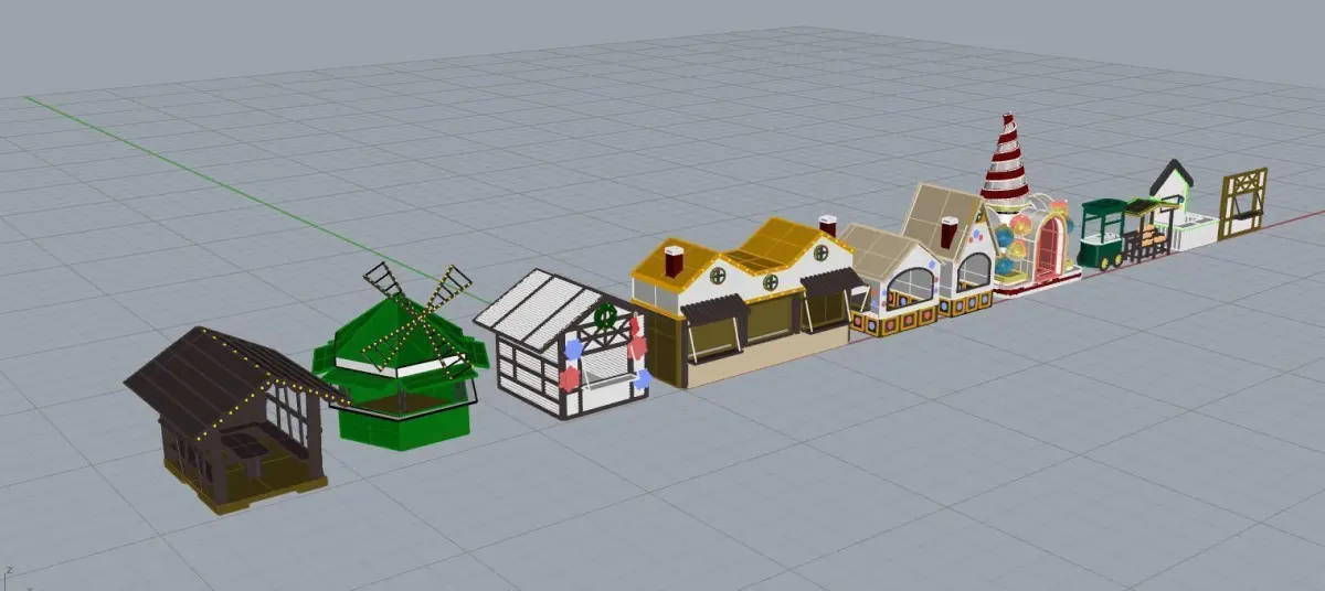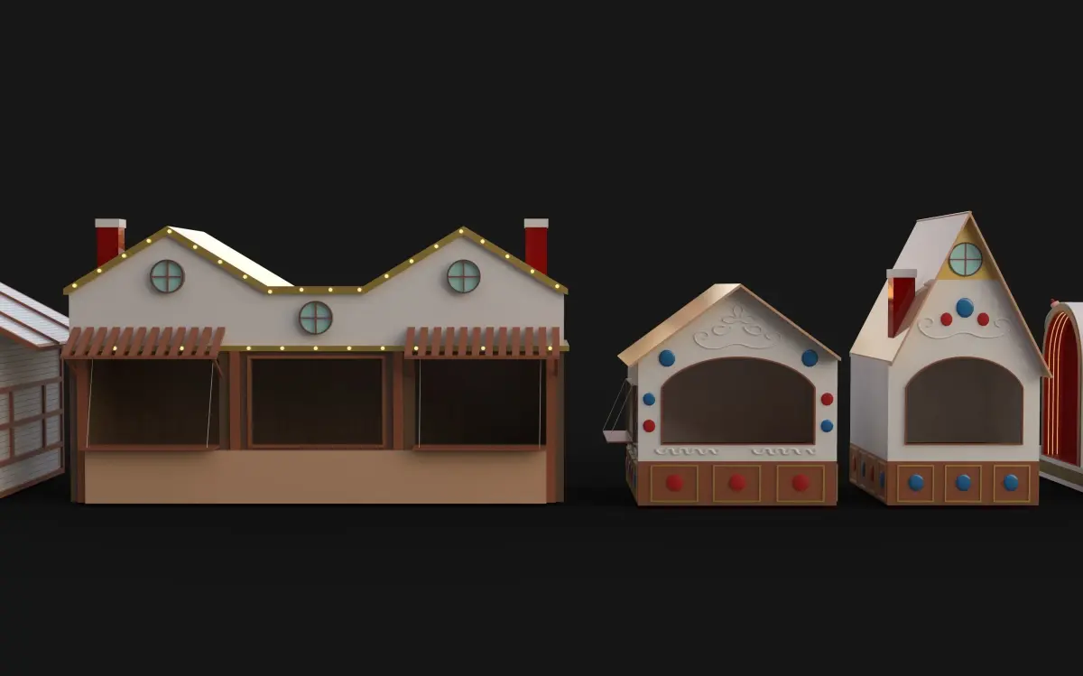tree house with bulbs5 different market shops Installation4 market stands