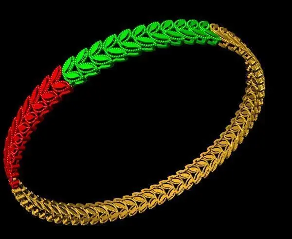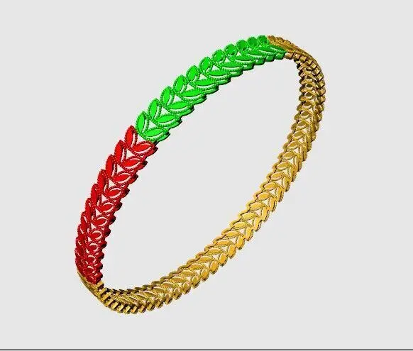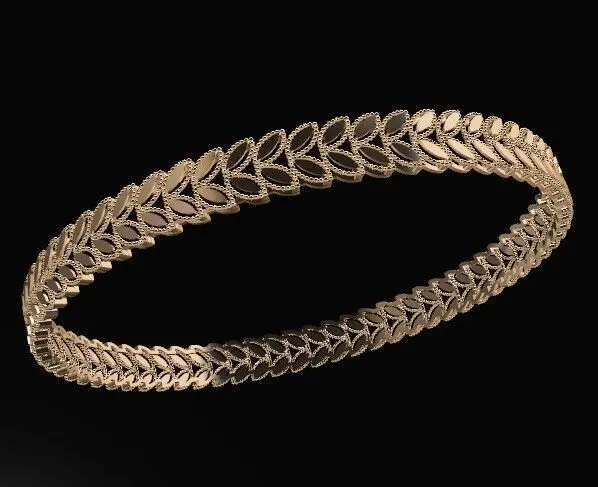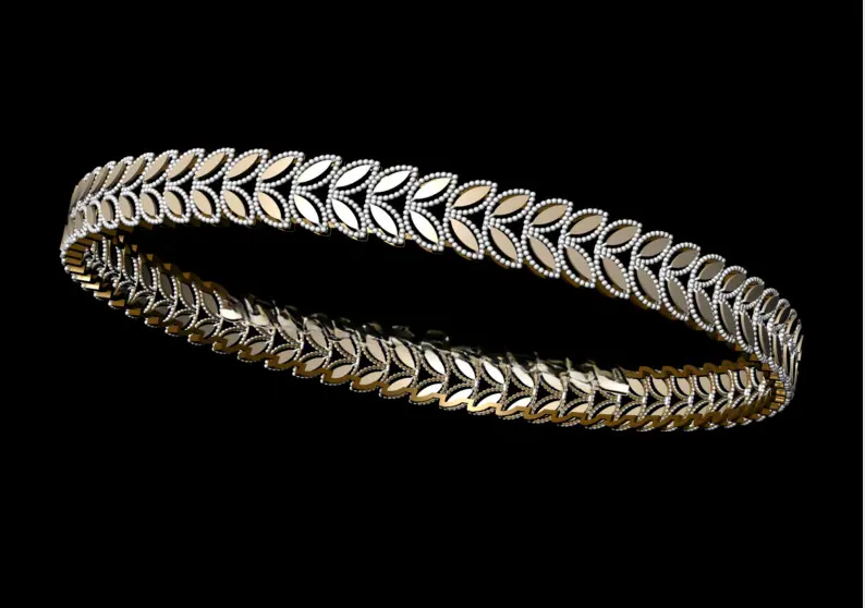 Overlapping Leaf/Petal Motif: The bangle's surface is covered in a continuous pattern of overlapping, scale-like leaf or petal shapes, providing a rich and tactile texture.Articulated and Segmented Appearance: The overlapping nature of the elements creates a visually segmented and almost articulated look, adding depth and movement to the design.Stylized Botanical Form: The leaf or petal shapes are elegantly stylized, offering a modern yet organic feel.Smooth Inner Surface: The inner circumference of the bangle is designed for comfortable wear.Precise Faceting Potential: The individual leaf/petal elements can be further enhanced with subtle faceting during production to catch the light beautifully.