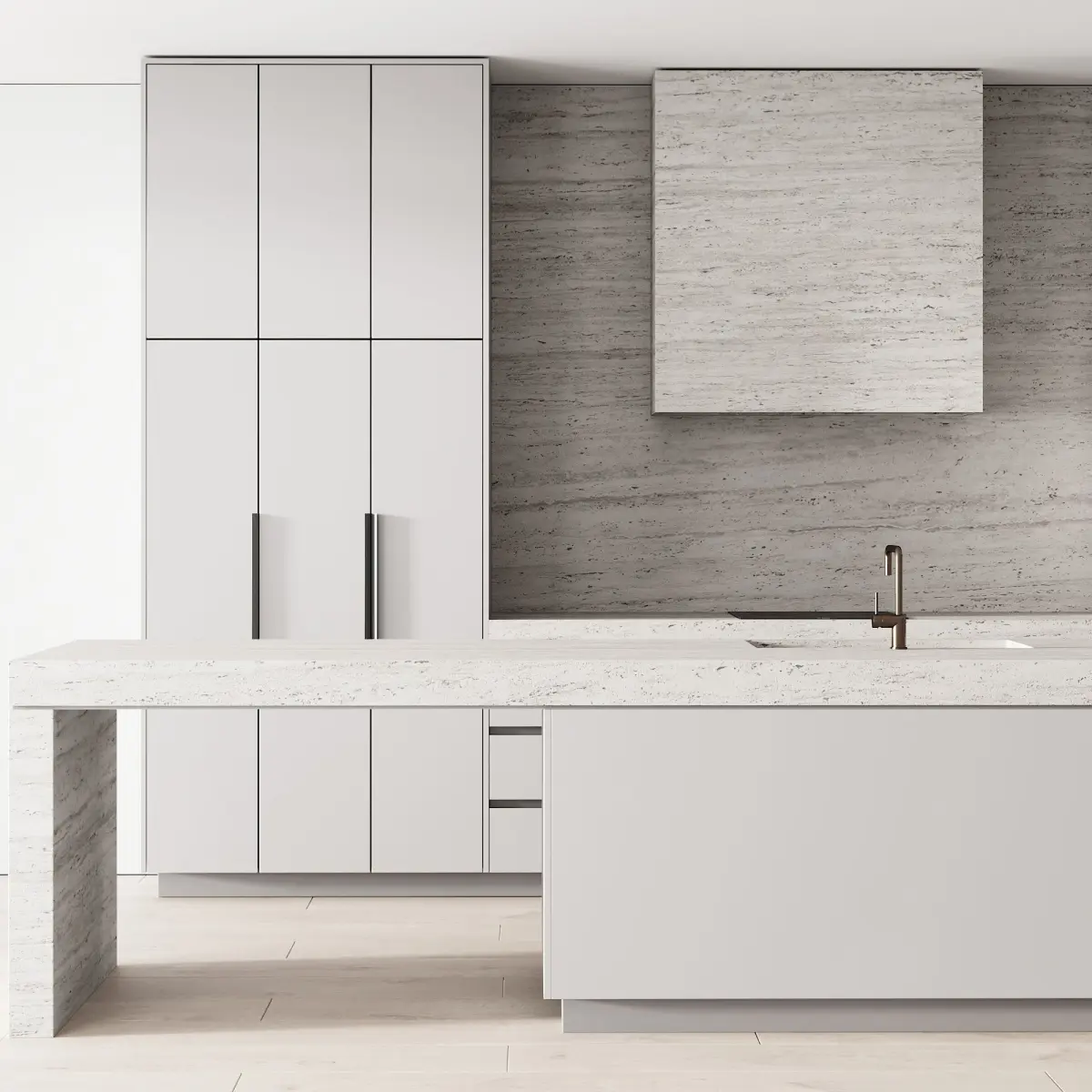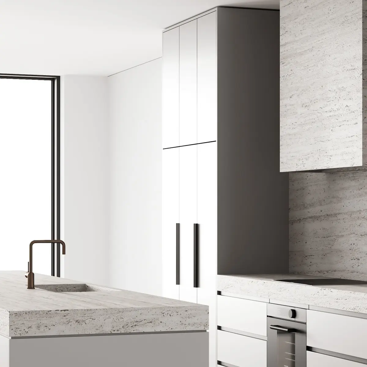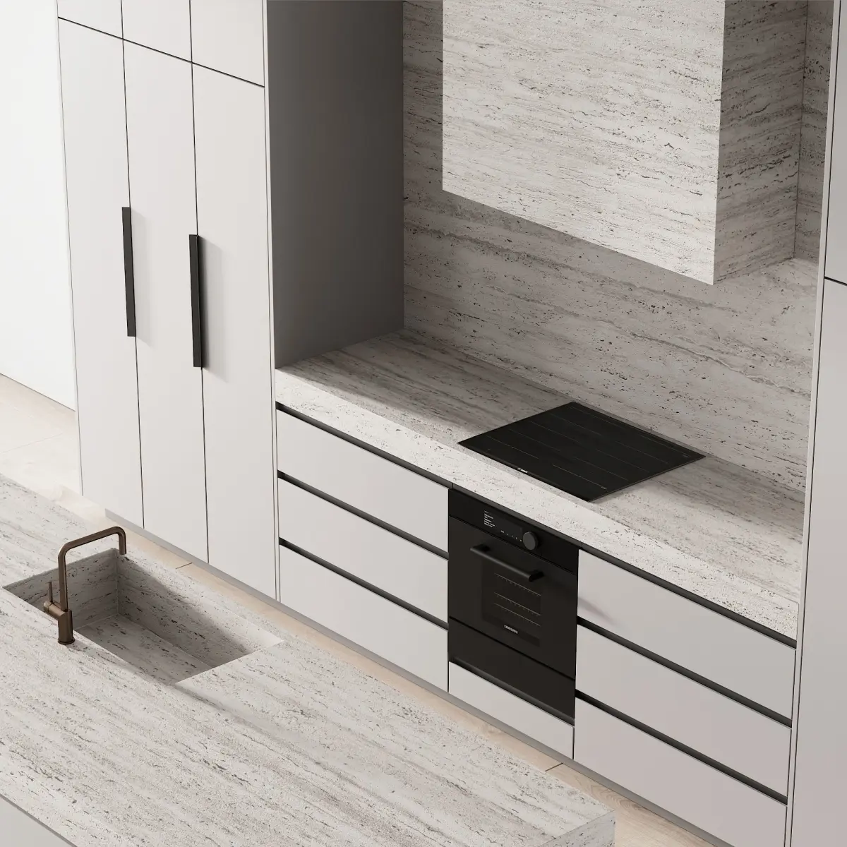 3d model of a kitchen in a modern style with a neoclassical bias. The kitchen has a mixer, sink, built-in extractor fan, induction cooker.All cabinets are made as separate objects, and the kitchen is assembled into a group. The whole kitchen is very easy to edit in size.