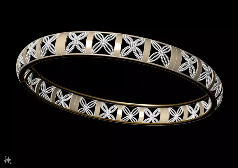 This stunning piece is a wide, closed-form gold bangle featuring an intricate openwork Jaali design. The surface is dominated by a precise geometric honeycomb mesh, which is sectioned by smooth, highly polished vertical bands. Set atop the mesh are elegant, raised stylized leaf or eyelet motifs that alternate across the width, adding a luxurious contrast in texture and shine. This combination of airy filigree and polished elements creates a striking, substantial look while maintaining a refined balance.