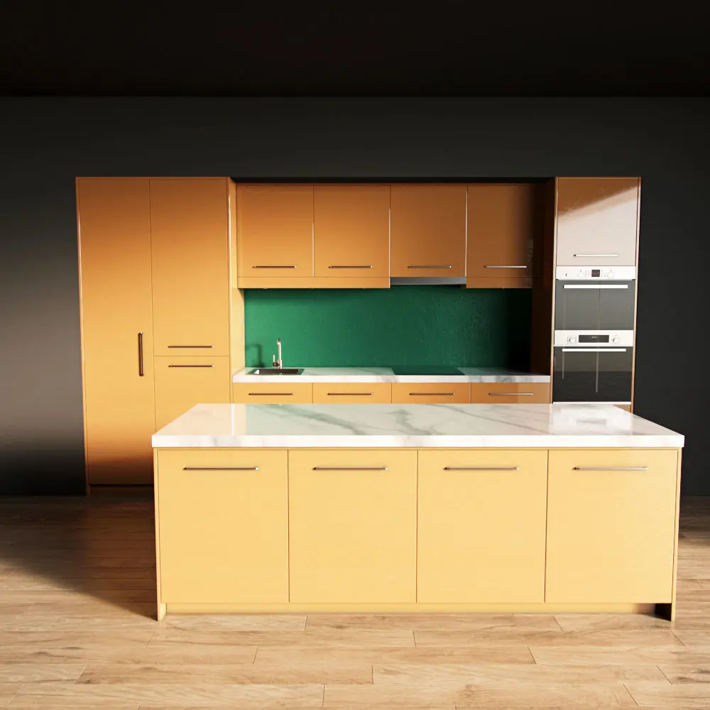 Only the kitchen and the island are present in the scene. The floor, walls, ceiling are yours.