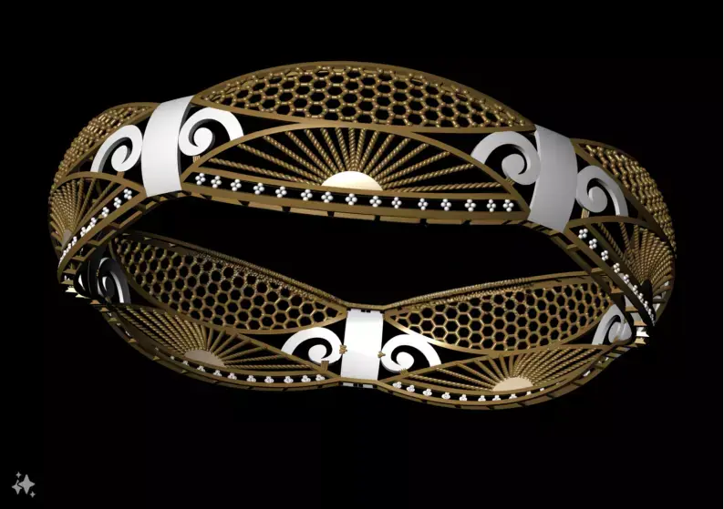 This 3D bangle model showcases a sophisticated fusion of traditional motifs and modern engineering, ideal for high-end jewelry manufacturing. Designed with a dynamic twisted form, the bangle features alternating sections of intricate honeycomb lattice, radiating sunburst patterns, and swirling filigree-style elements.