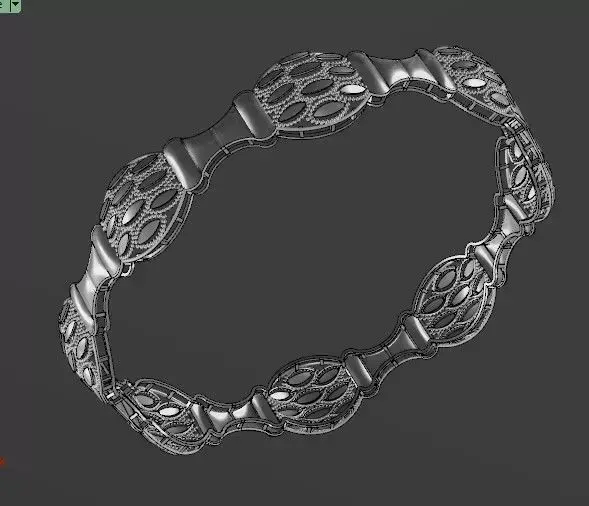 This gold bangle showcases a refined series of oval-shaped links, each intricately designed with openwork patterns resembling leaf or petal motifs. The symmetrical arrangement is connected by solid gold joints that ensure structural integrity and fluid movement.