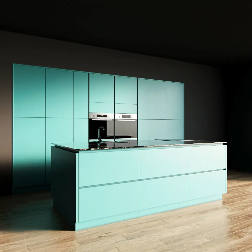 Only the kitchen and the island are present in the scene. The floor, walls, ceiling are yours.