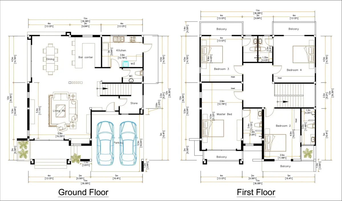 An 11x12 Metre (36'x39') House Plan is a detailed design for a 1,296-square-foot home. This plan includes comprehensive AutoCAD drawings, featuring precise floor plans, elevations, and sections to guide your construction. A detailed furniture layout is also provided in PDF format, ensuring optimal placement of every piece within each room. The package also includes a 3D model in SketchUp format, along with .obj and .fbx files, making it compatible with a variety of 3D software programs. We also offer optional electrical and plumbing layouts upon request. The included 3D model enables you to visualize the completed house in great detail, including furniture arrangements and interior finishes, giving you a realistic preview of your future home.