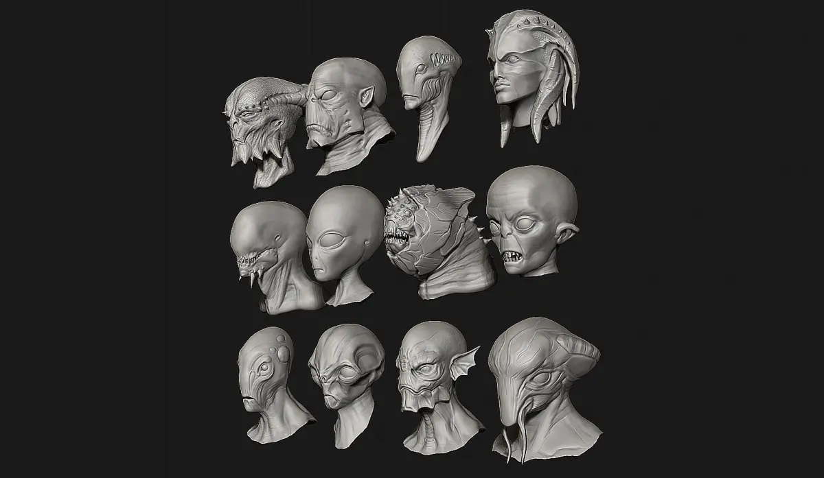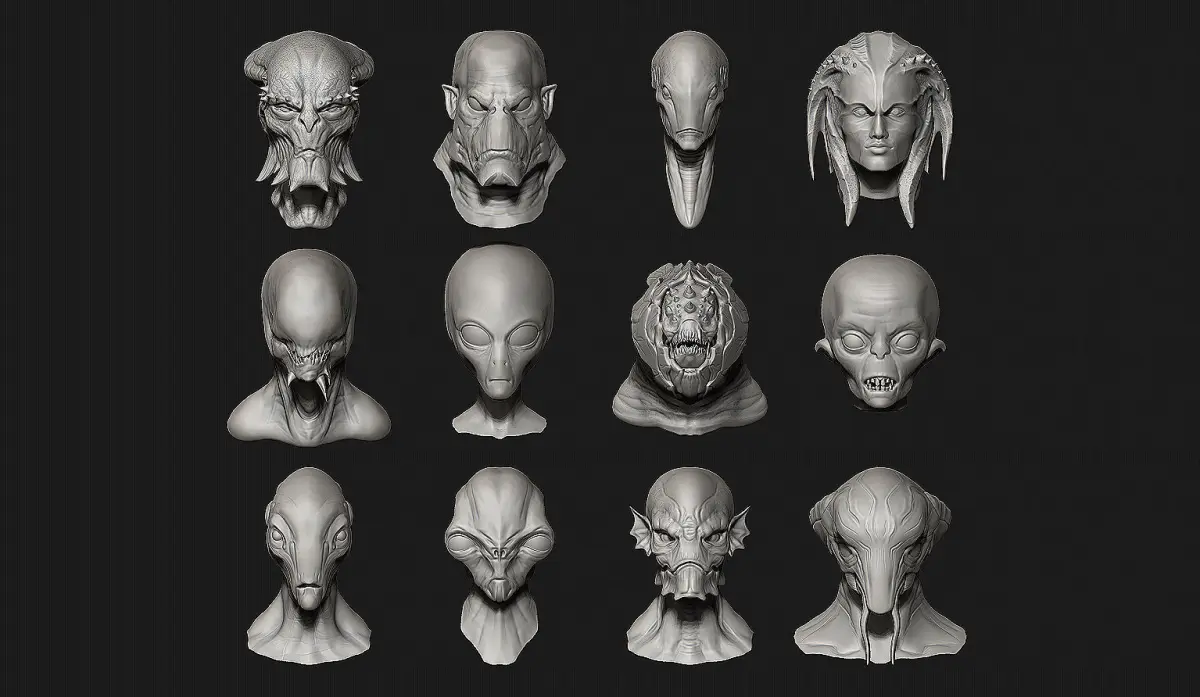 Hello guys!Check out the new collection of a humanoid creatures which was made in Zbrush 4r8.This" Aliens Heads" pack consist of 12 heads of different sci-fi creatures.I tried to create a unique design for each character, with a good level of detail, for you.Available formats:- ZTL (Zbrush 4r8 required to open)12 ztl files of each head separately, and one ztl with all heads.Splited on subtools;- OBJ12 obj files of each head;- STL12 stl files of each head (Merged, decimated topology, good for 3d printing)Total polygon count for all heads is around 4,8 million polygons.Models dont have a good topology, this is a high poly sculpt, remember that!*************************I hope it will be usuful for you!
