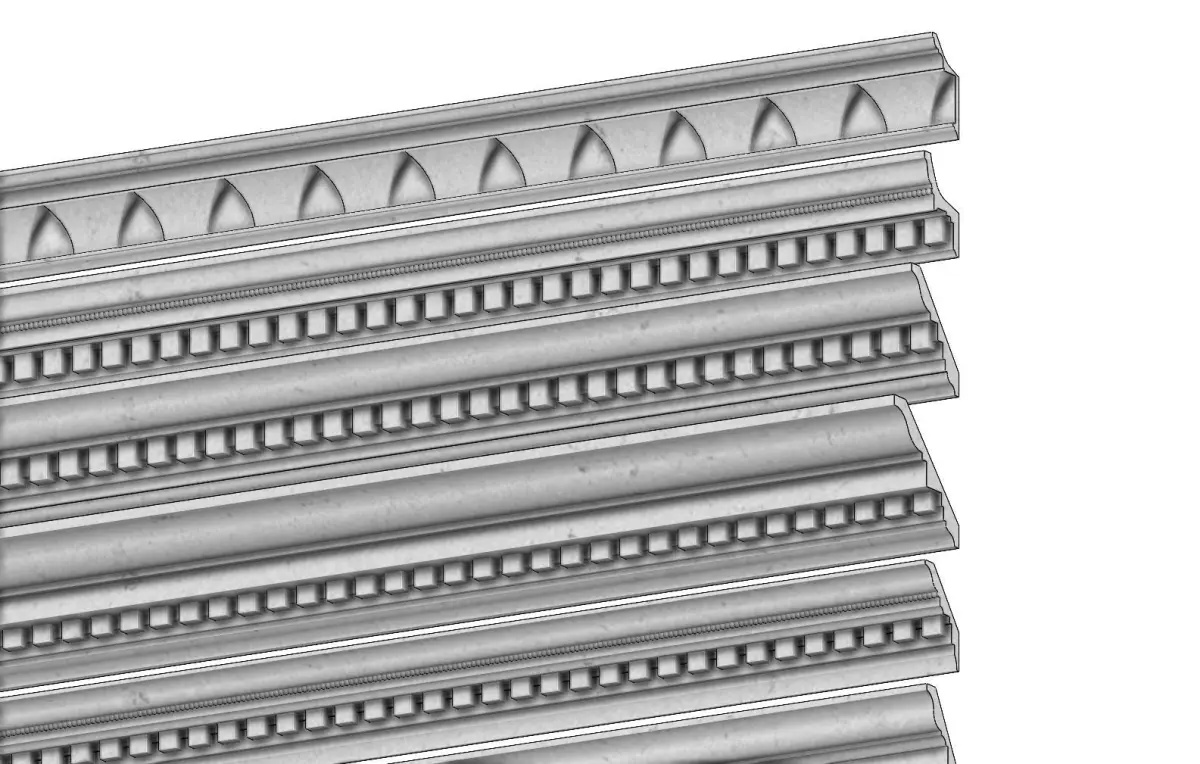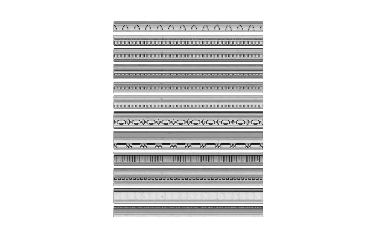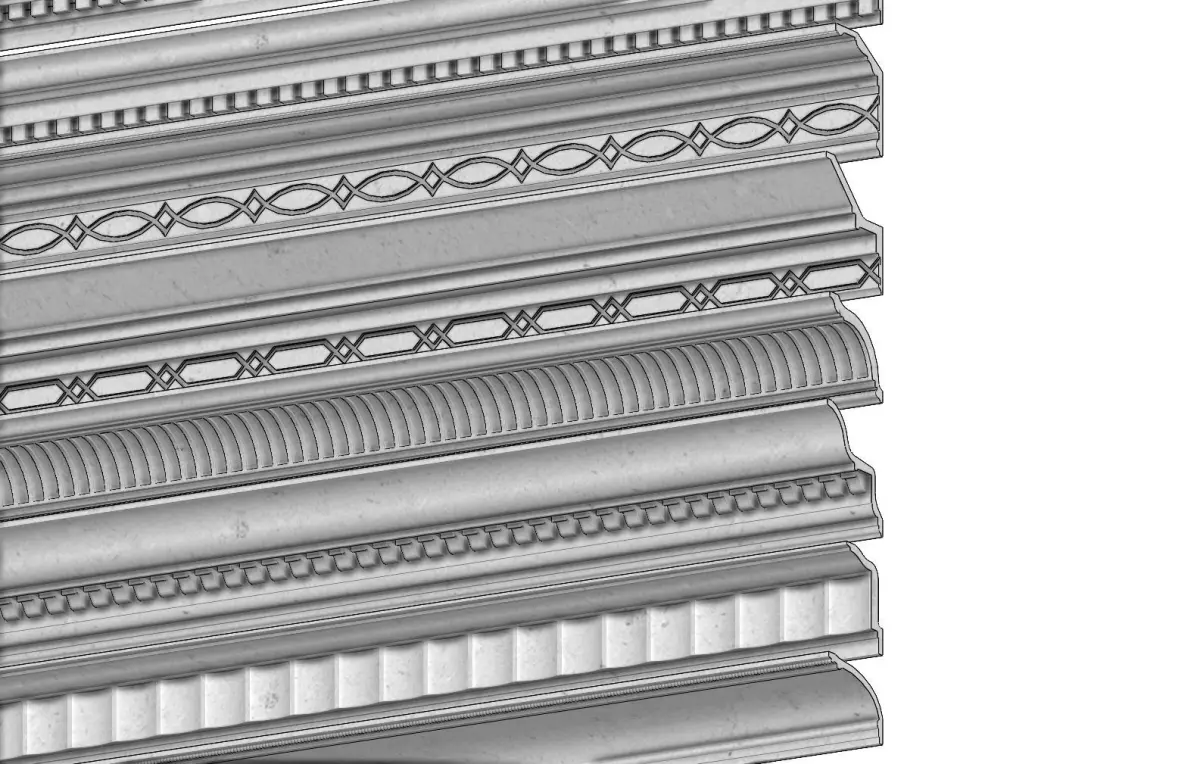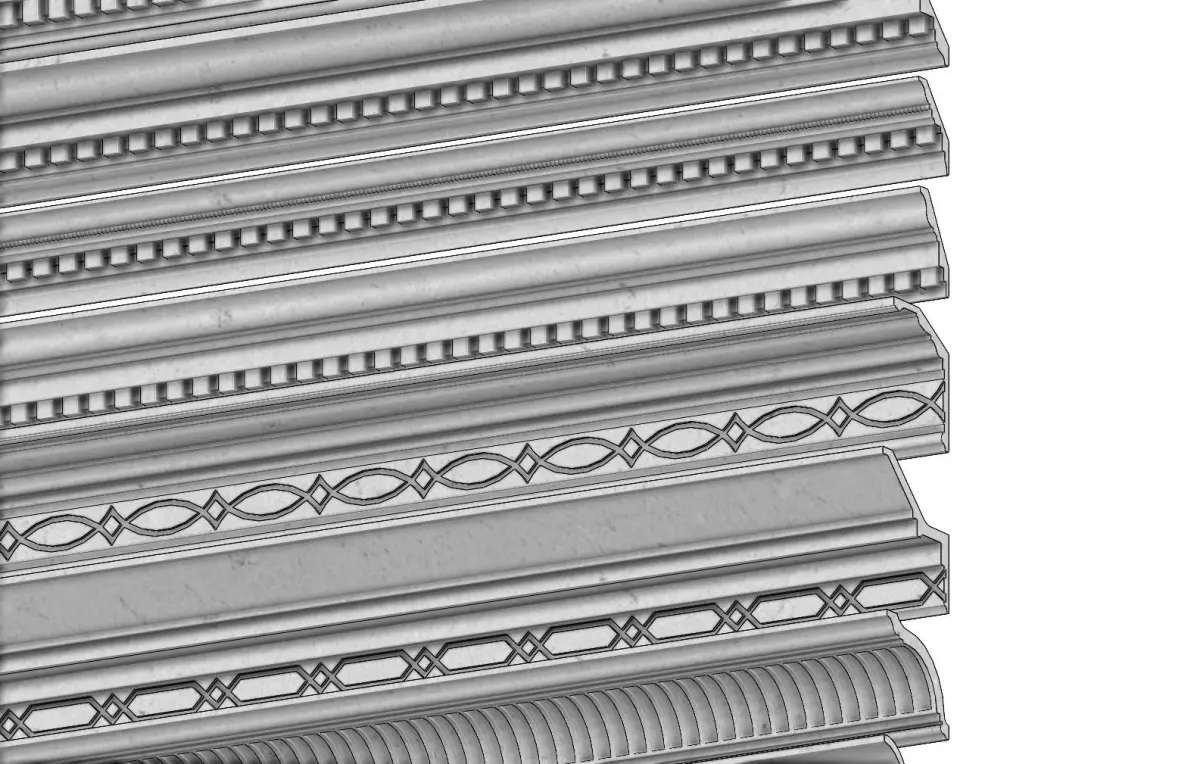 12 cornices for plaster and wood workings.All the models are watertight volumes perfect for 3d printing and cnc machining.All the sharp edges are rounded with a fillet of 1mmAll the linear patterns on the cornices are centered on the 2m lenth