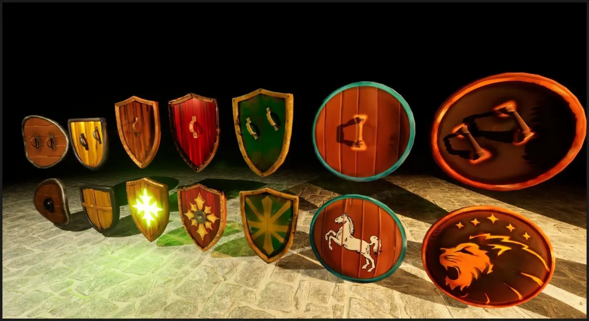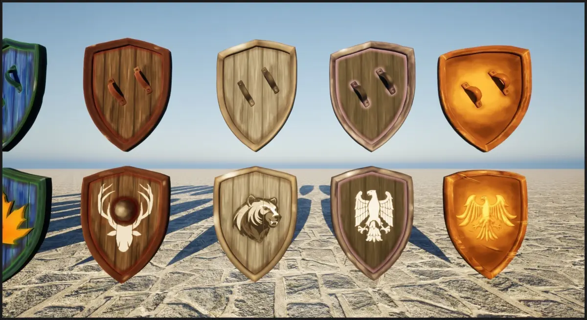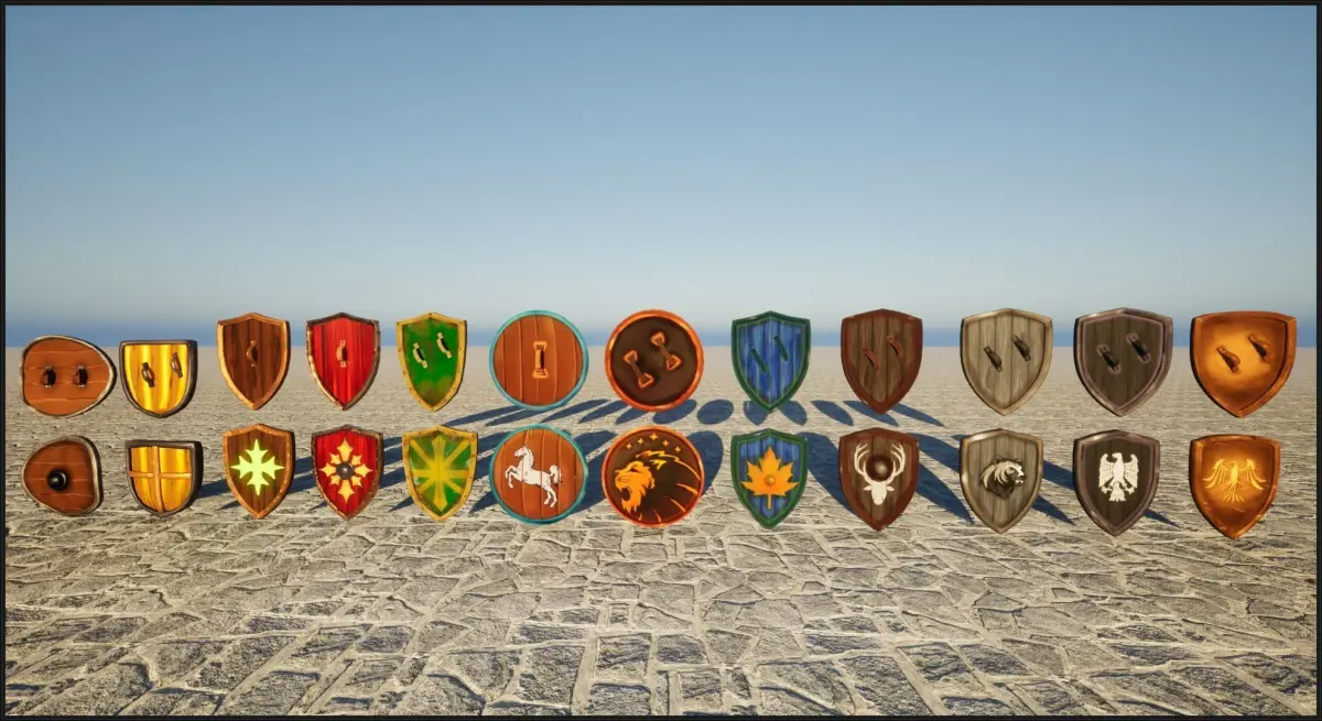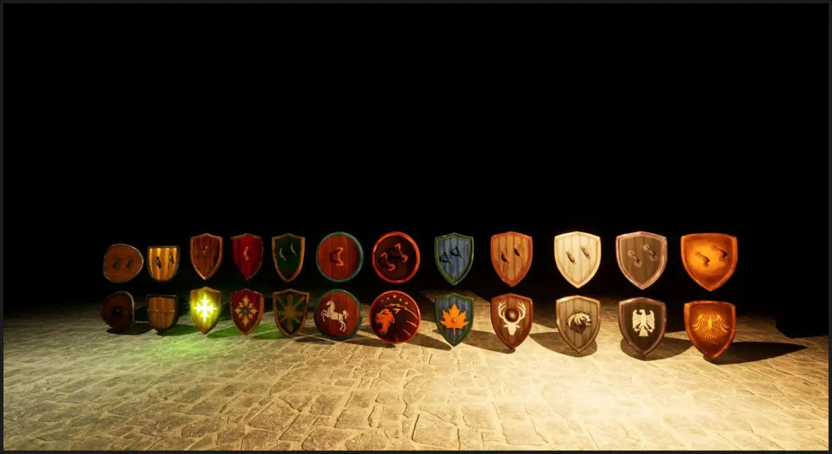 This pack of shields includes 12 different handpainted stylized medieval shields.