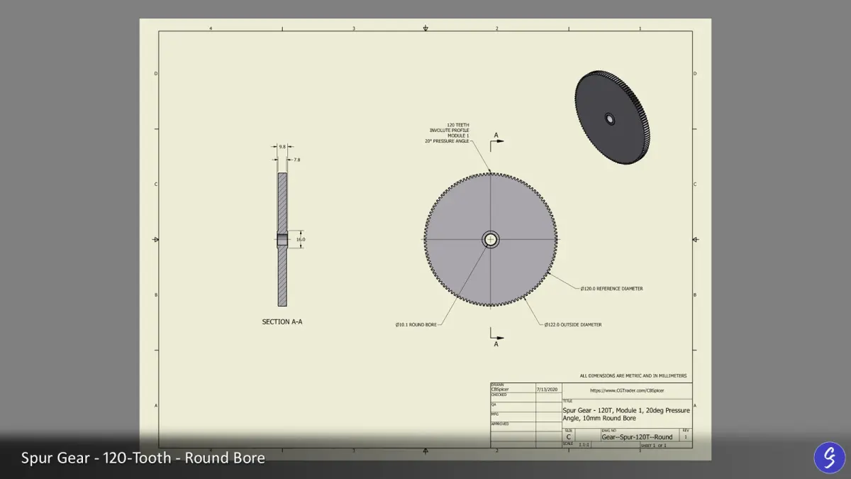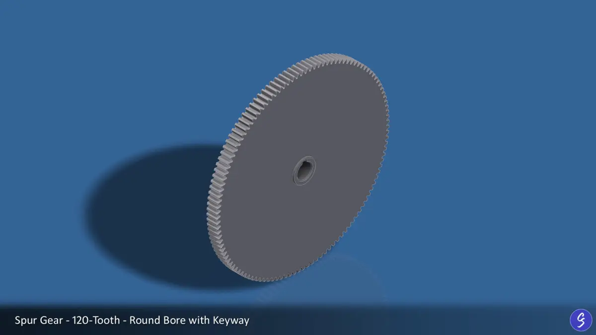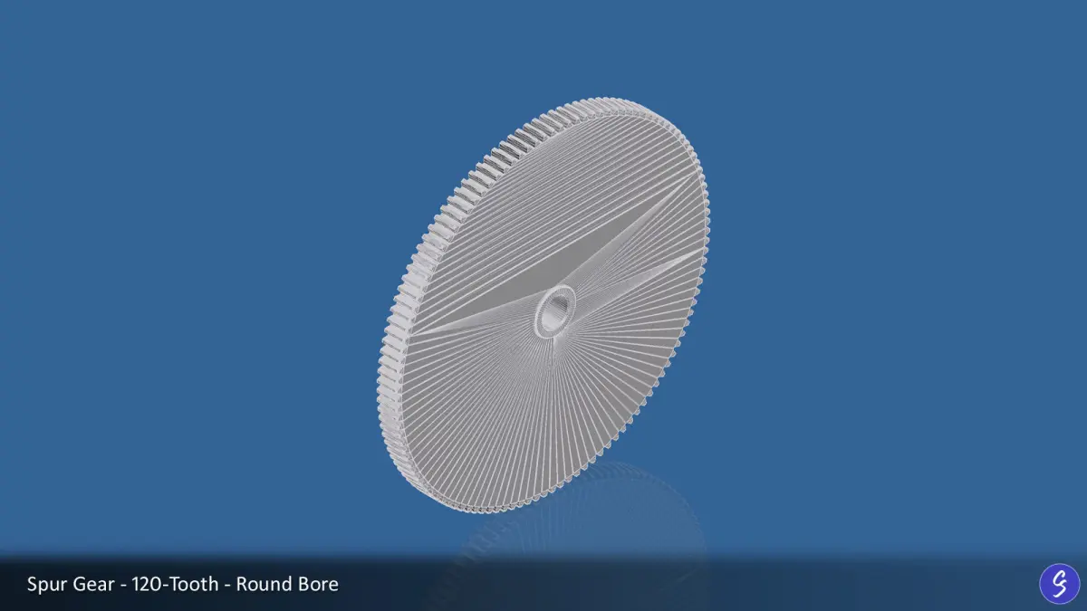 120-tooth spur gear, provided with multiple bore styles, accurately modeled and ready for use in CAD, CGI, and 3D print applications. Modeled in Autodesk Inventor and provided in multiple file formats. Perfect for both digital and physical mechanical design projects.