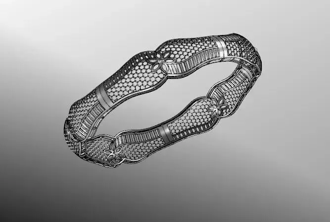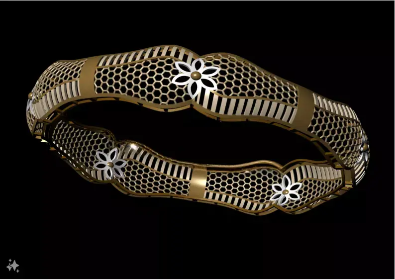 This 3D model represents a high-detail ornamental gold bangle featuring a repeating segmented structure. Each segment is shaped with a gentle arc and includes a central floral motif framed by mesh-like openwork detailing. The alternating solid and perforated sections create a rhythmic visual flow, enhancing both elegance and breathability.