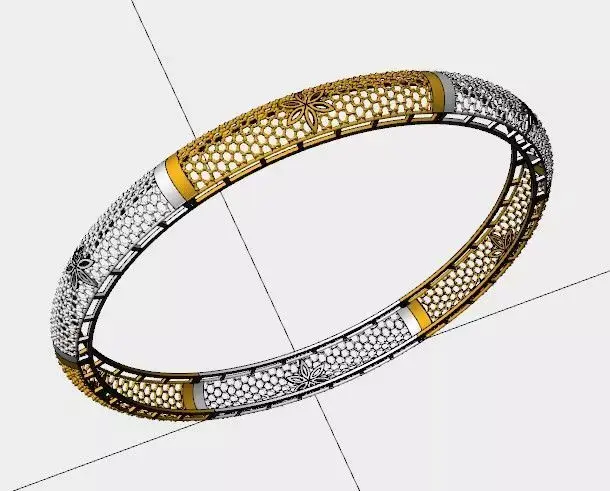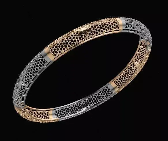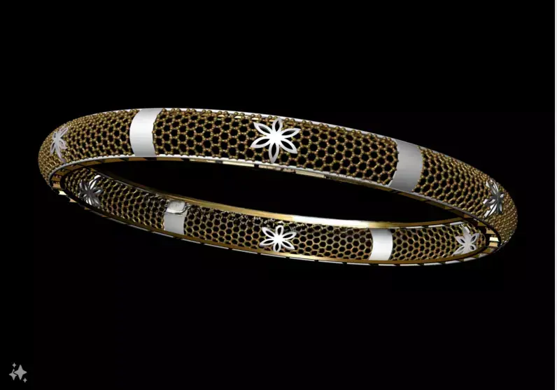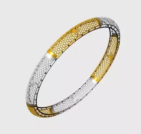 This bangle presents a symmetrical dual-tone design, combining gold and silver finishes across a mesh-textured surface. Embedded within the mesh are repeating floral/starburst motifs, offering a refined balance of metallic contrast and ornamental detail. The structure is optimized for precision casting and high-end finishing.