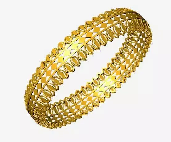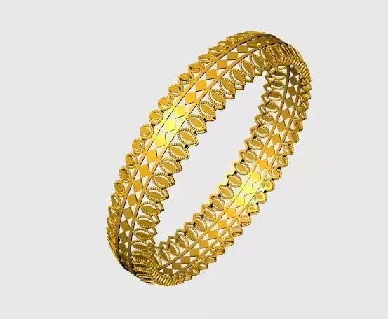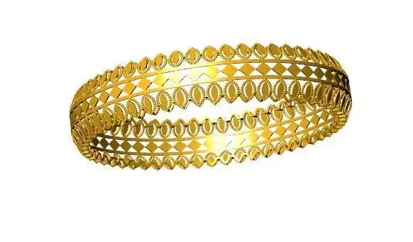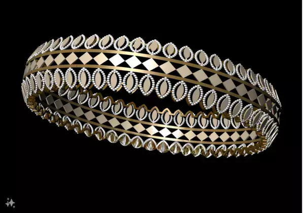 This bangle features a multi-band structure combining geometric tessellation with ornamental loop detailing. The central band showcases a repeating triangle pattern in alternating black and gold tones, flanked by symmetrical rows of oval-shaped loops bordered with beaded accents. The design offers a balanced blend of modern geometry and traditional embellishment.