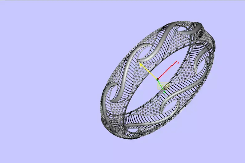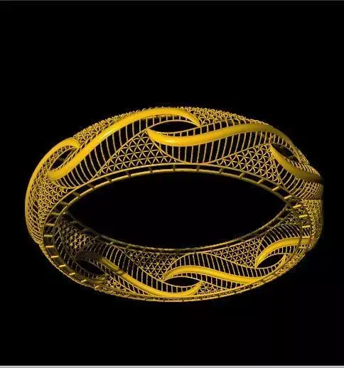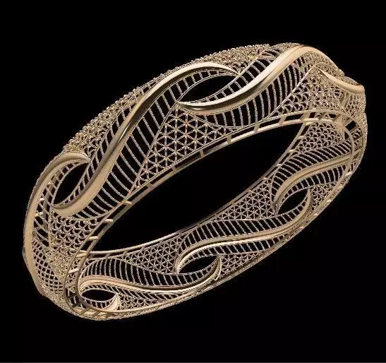 This bangle showcases a fusion of flowing curves and geometric meshwork, combining triangular lattice structures with filigree-style wire detailing. The design offers a sculptural elegance ideal for high-end casting and precision finishing, balancing openwork artistry with structural integrity.