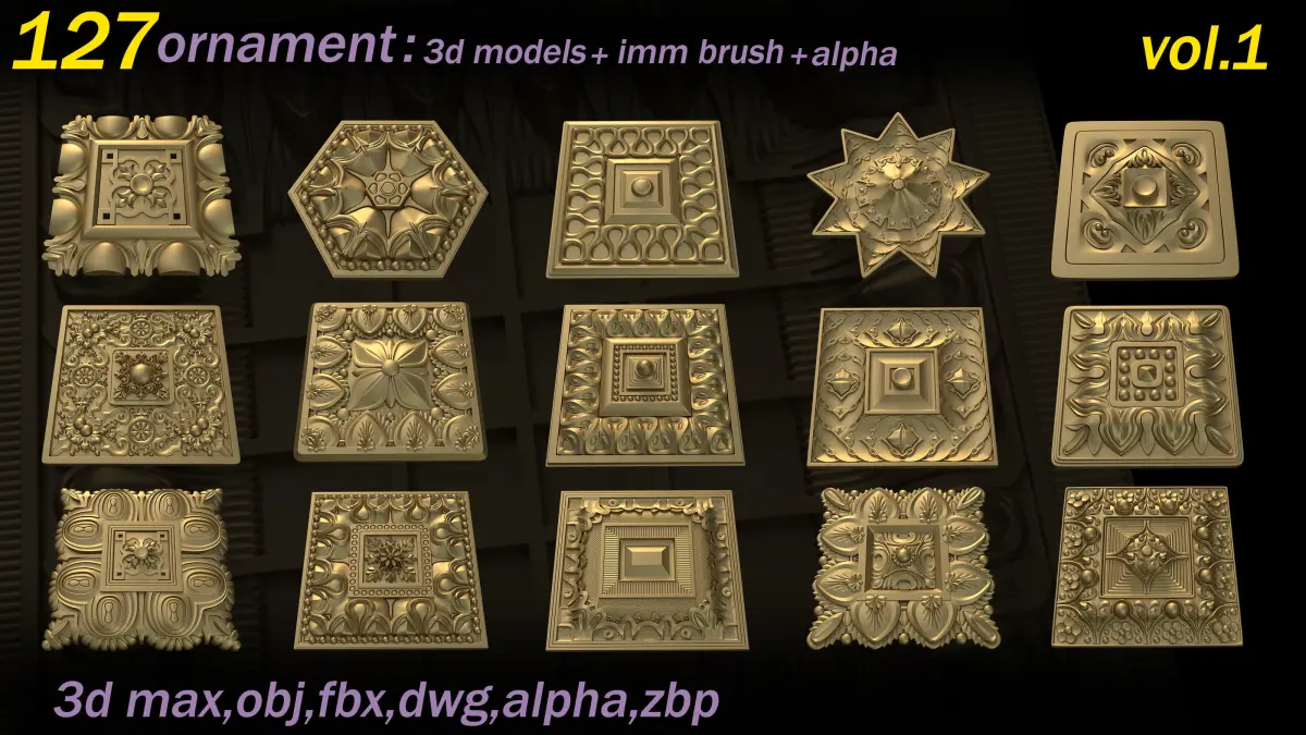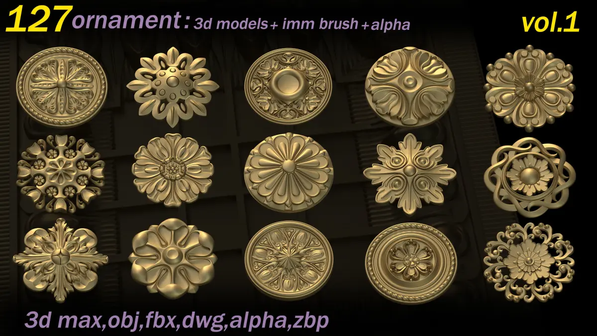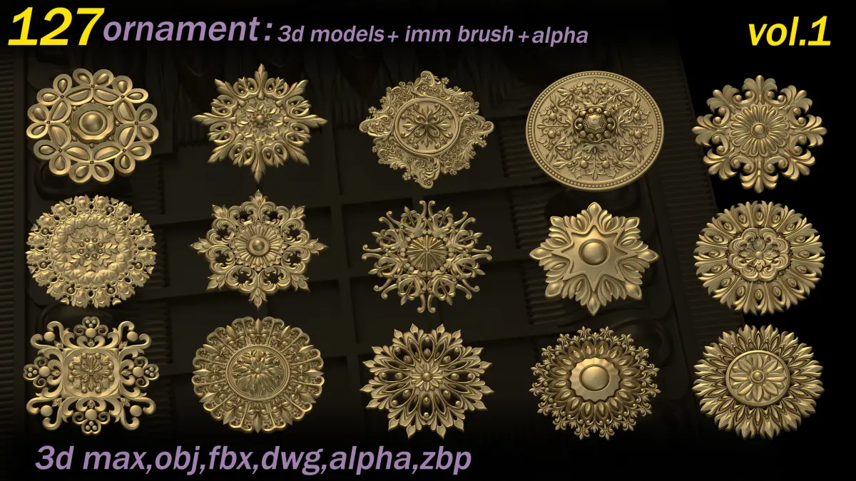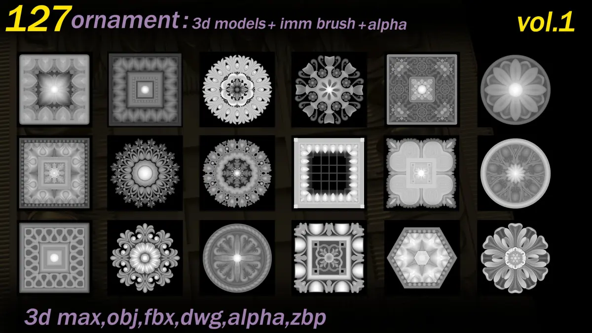This Product includes 127 Ornament Brushes for Zbrush and 3d models(max,obj,fbx,dwg) for use any 3d software (3dmax,maya,blender,C4D, ... )