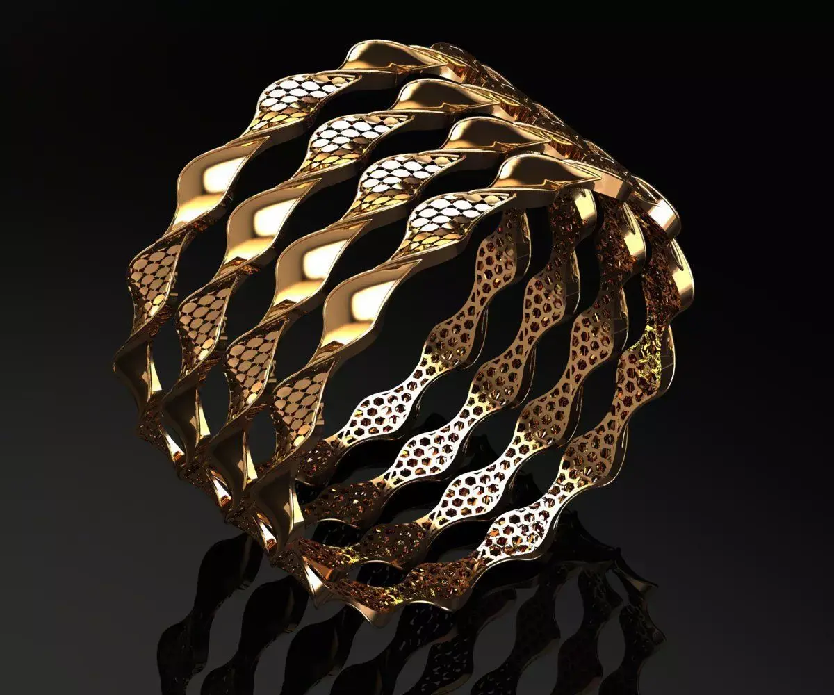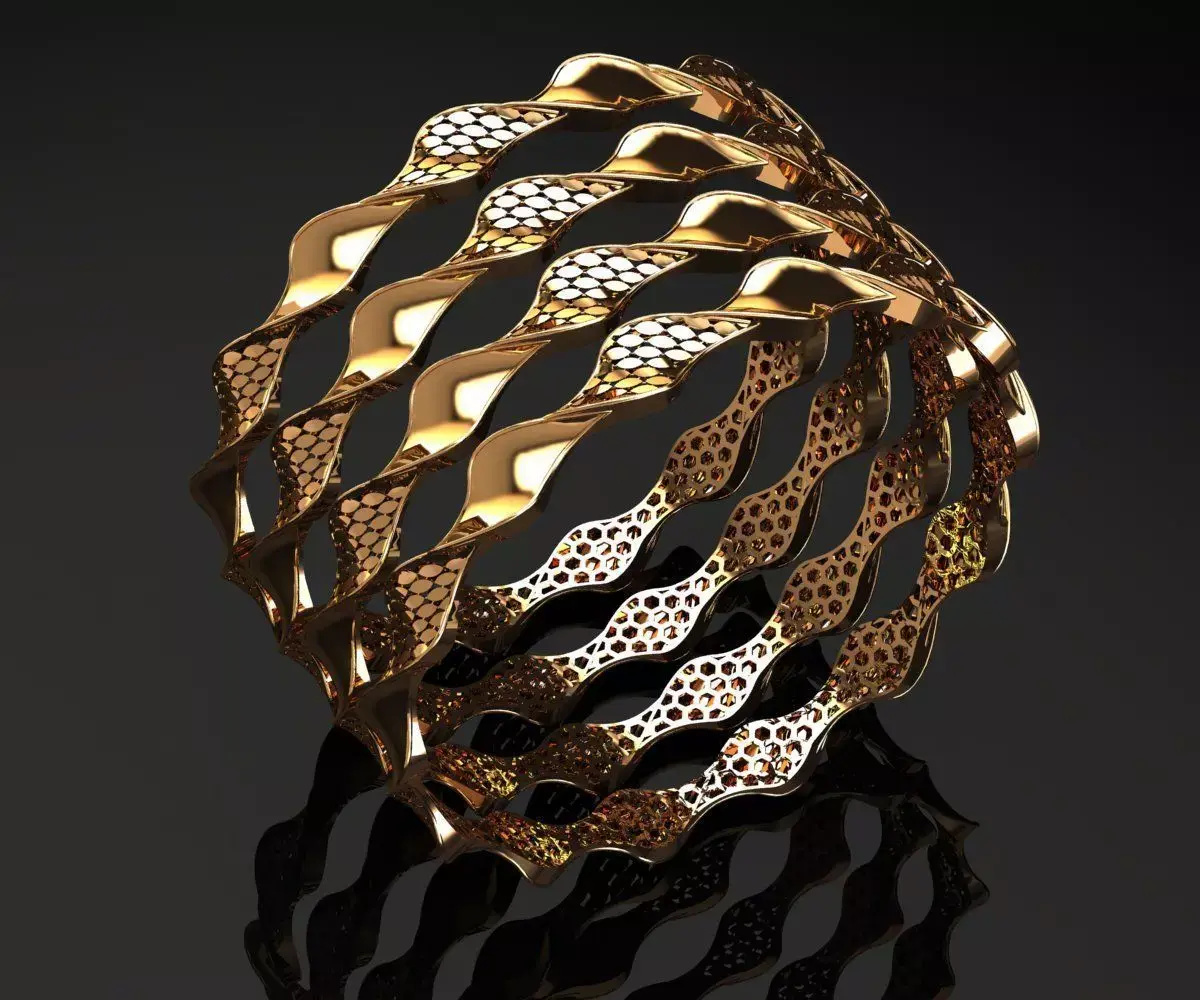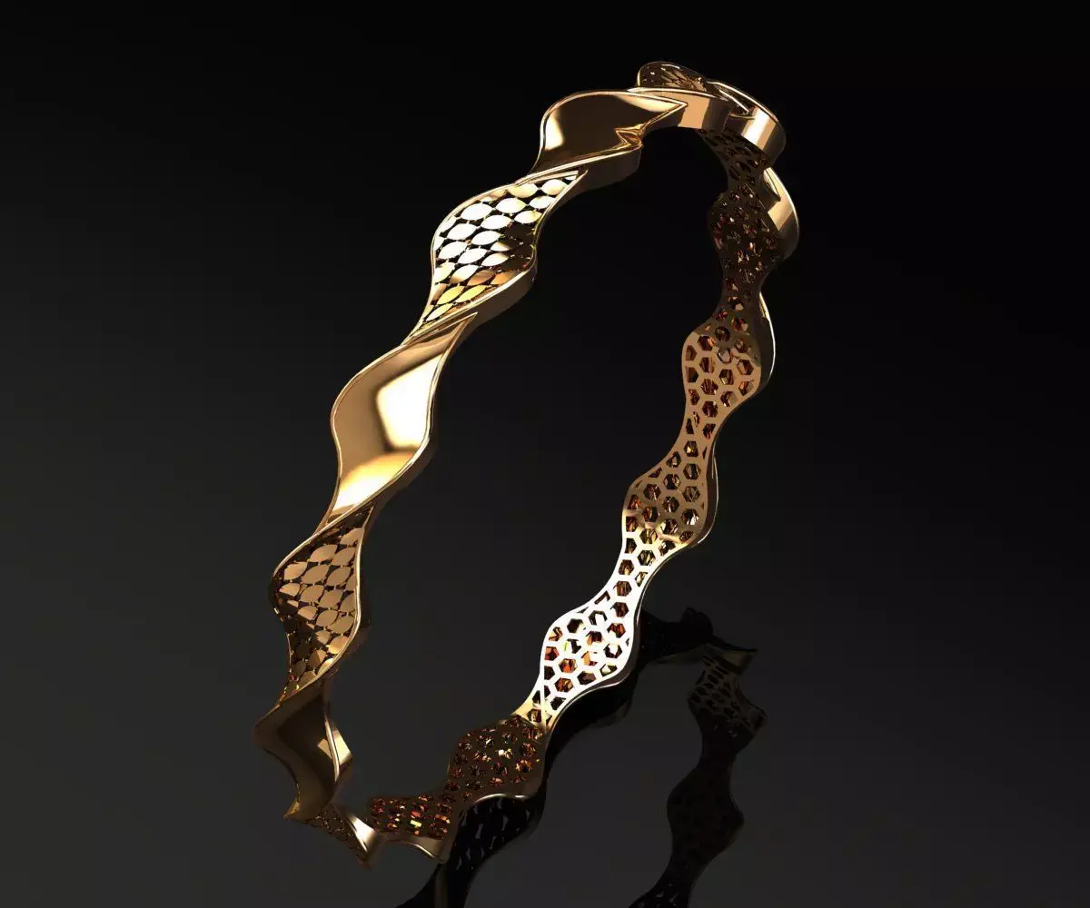 This bangle features a sculptural, wave-inspired geometry with alternating solid and perforated segments, creating a rhythmic interplay of light and shadow. Crafted in high-polish gold finish, the design showcases a continuous undulating pattern that enhances visual depth and dimensionality. The perforated sections are precision-cut to maintain structural integrity while reducing metal weight, optimizing both aesthetics and material efficiency.