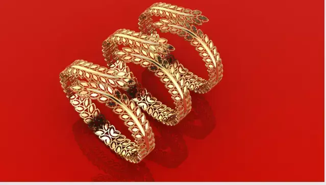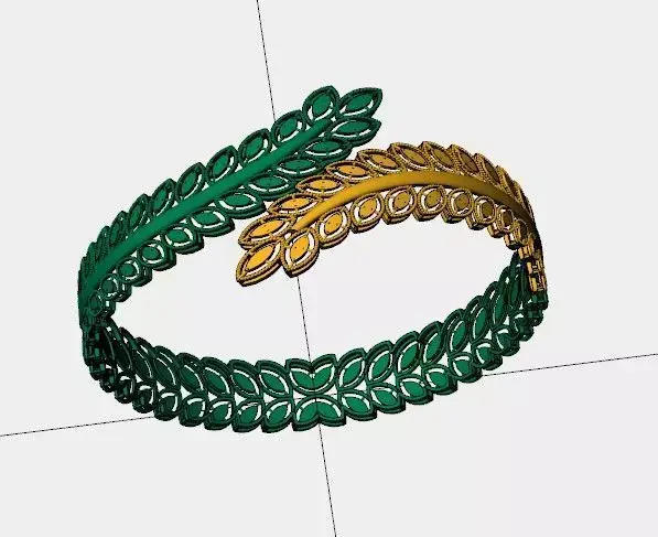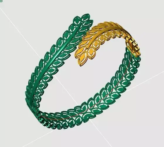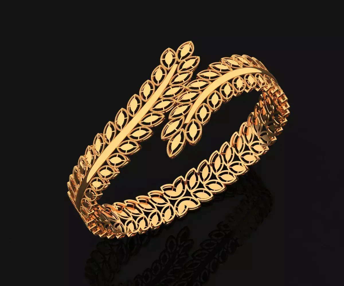 This is a high-resolution, manufacturing-ready 3D model of a broad, openwork bangle or cuff featuring a detailed leaf filigree design. The design is characterized by multiple overlapping rows of stylized, symmetrical leaves, creating a continuous, airy, and textured surface.