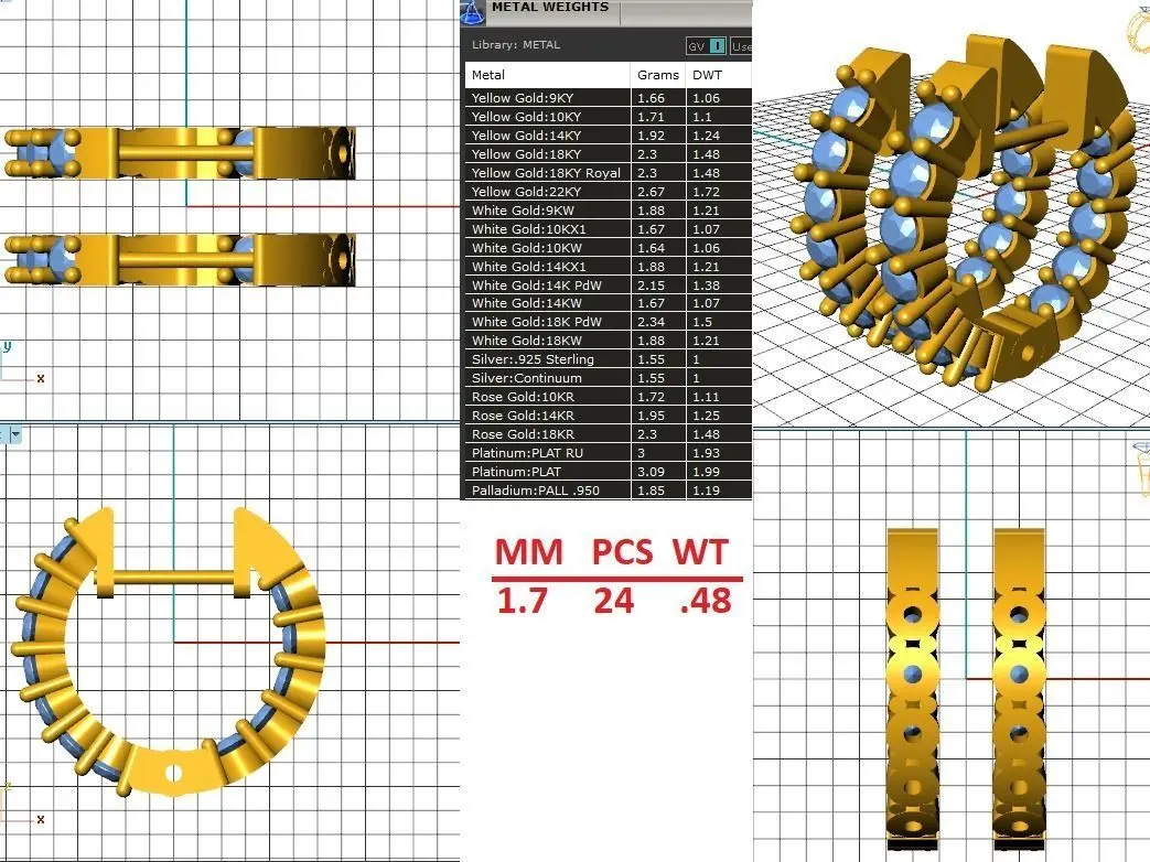 Diamond Jewelry 12mm Inside-Outside Shared Prong Diamond Hoop Earrings, Functional 3d Model of Diamond Jewelry, Fine Jewelry earrings 3d print ready & ready to cast. 3d file made in Rhino & Matrix by expert jewelers & expert cad designers. Post is included1.7mm Diamonds & 0.5inch diameter Hoops