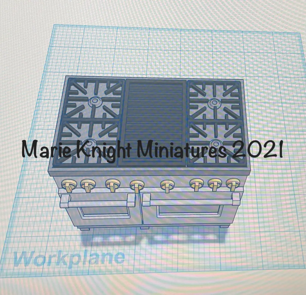 This download includes six files to print and assemble a 12th scale Wolf range 3.5 inches wide. Parts include the range box, legs, lower front panel, range top, burner covers, and doors. Doors to NOT open.