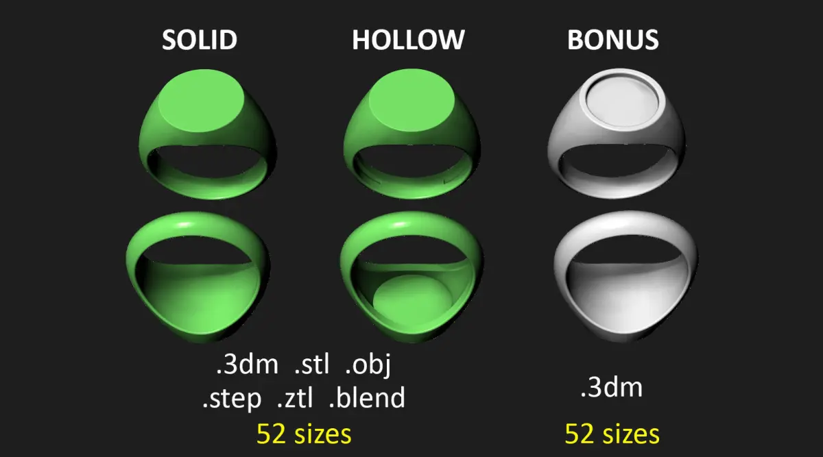 Also, the package contains .ZTL (ZBrush 2021.1) and .BLEND (Blender 3.2) files, in which all ring sizes are centered and collected in one file.