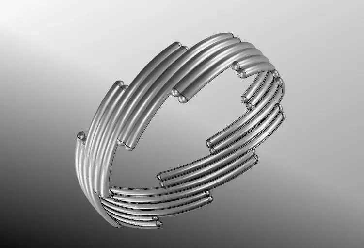 The Modular Gleam bangle is a contemporary, gold-toned design featuring a series of interlocking curved segments arranged in a staggered formation. This structure creates a dynamic visual rhythm while maintaining mechanical integrity and wearability.